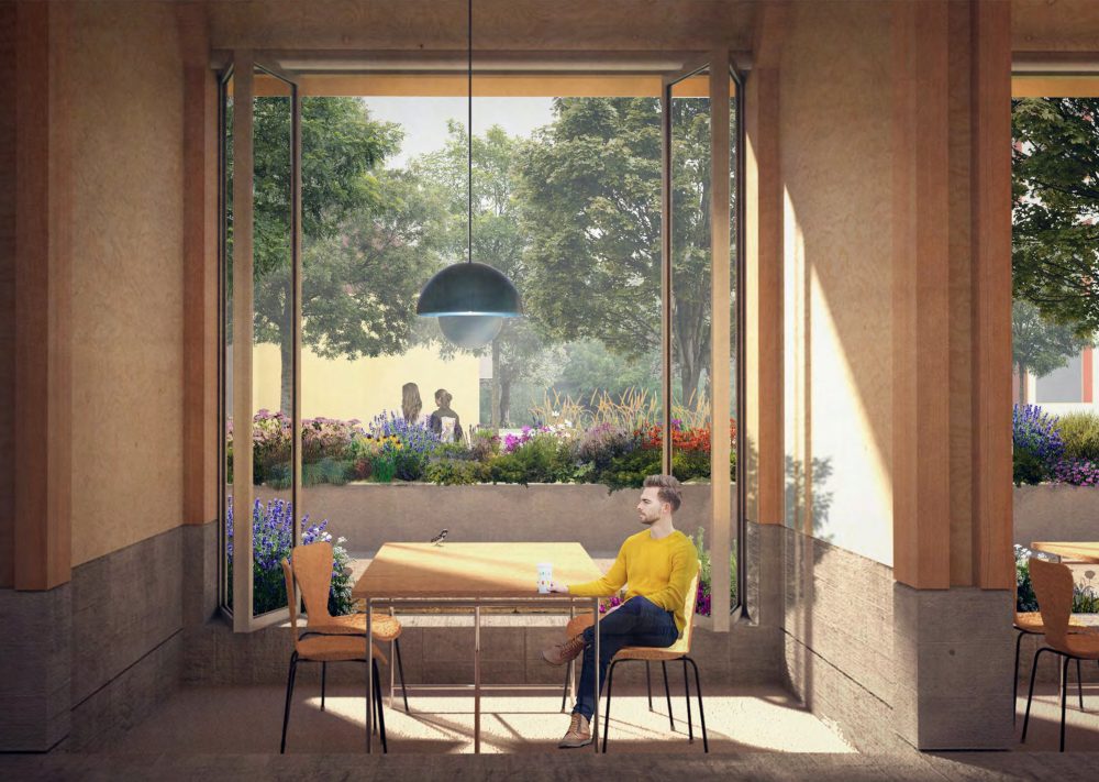 Die Mensa gliedert sich in drei Hauptzonen: einem dem Uniplatz zu