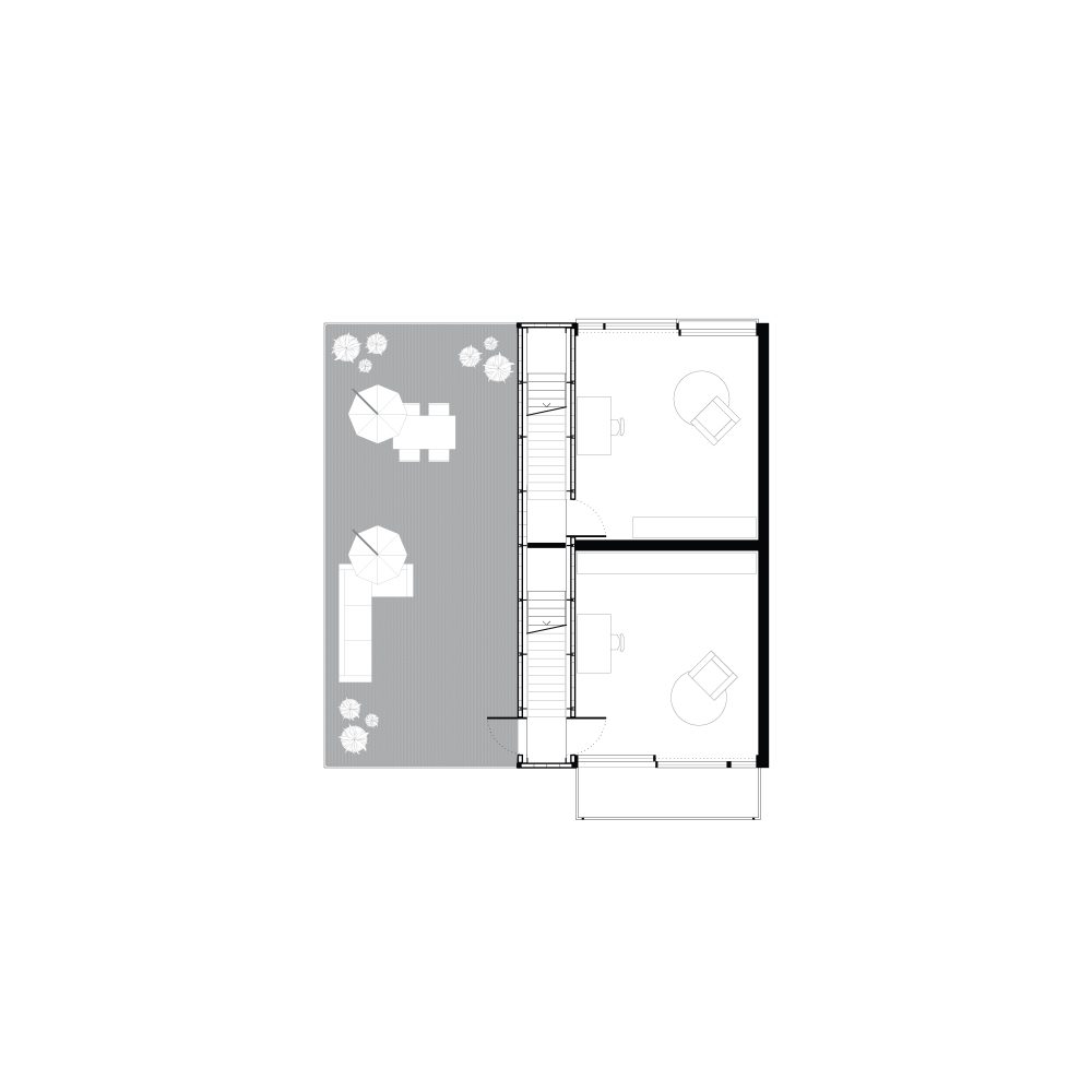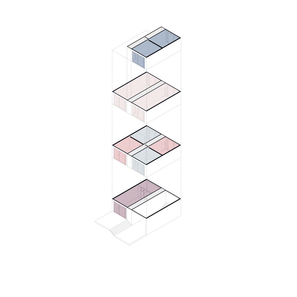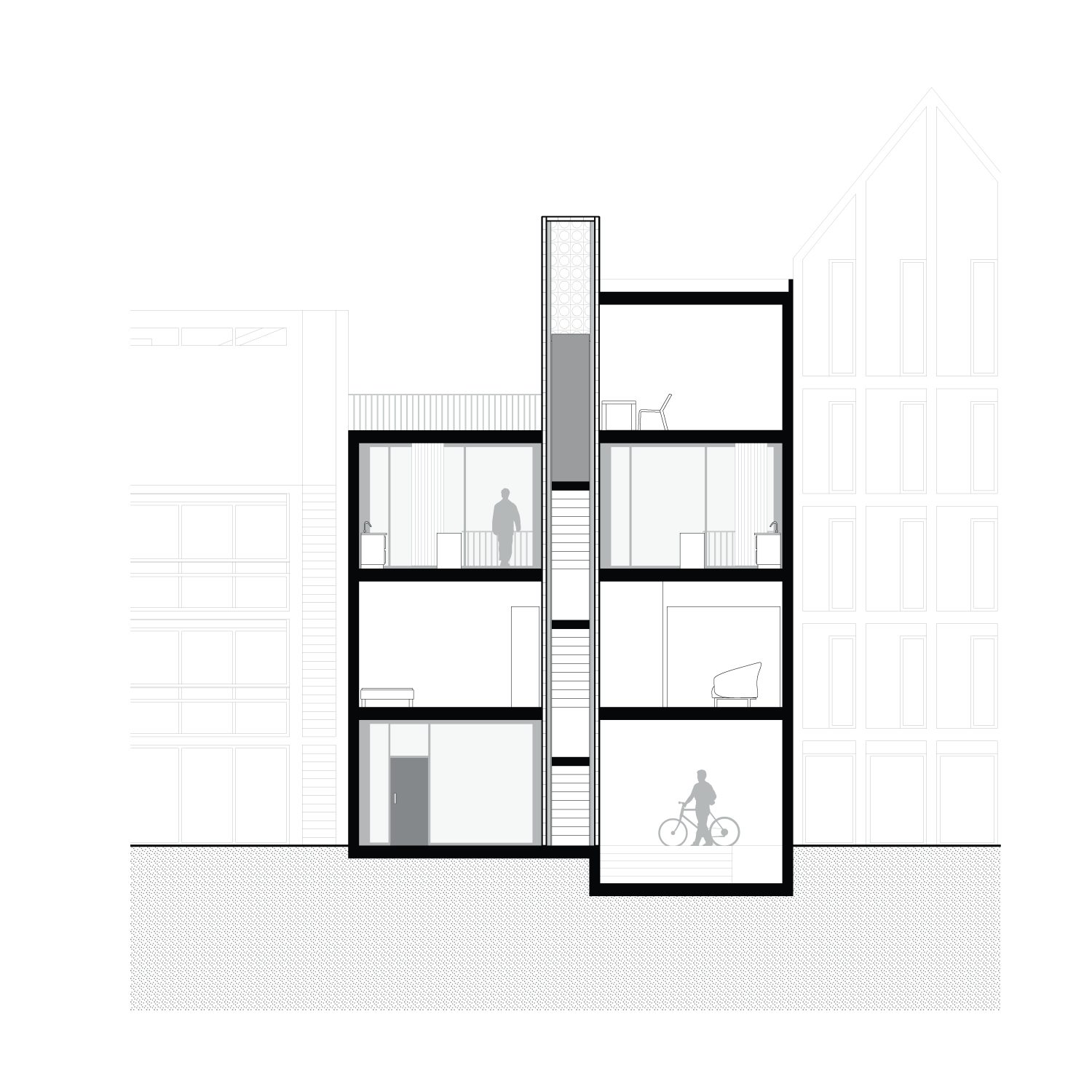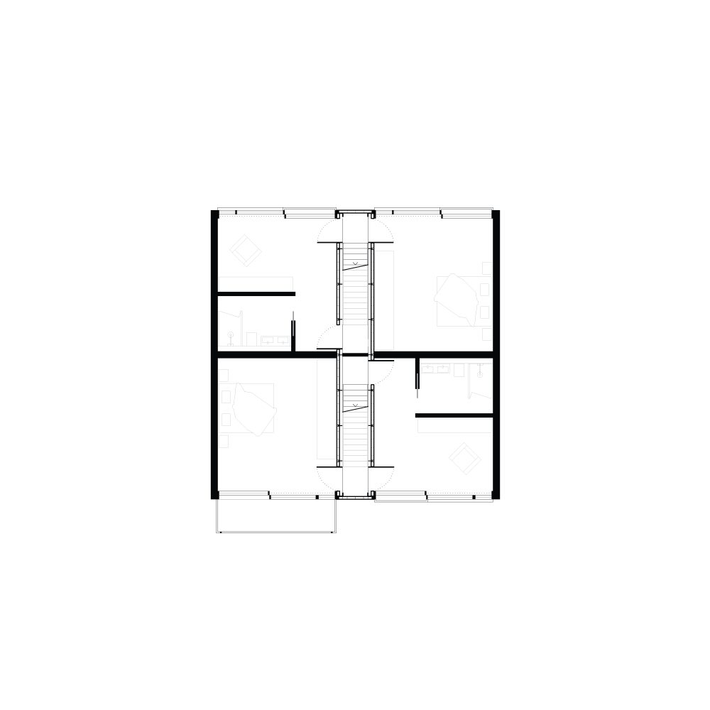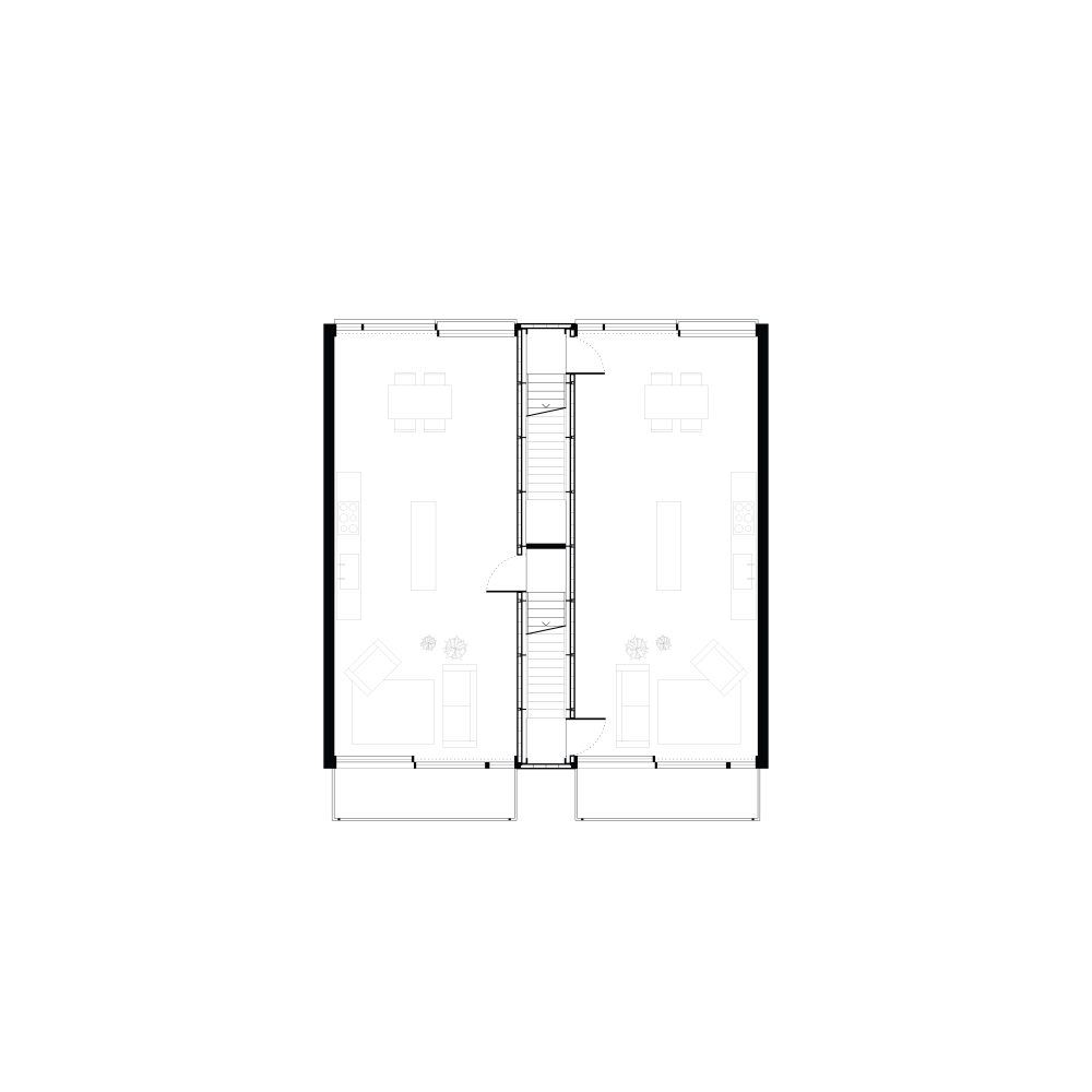 Im Antwerpener Stadtteil Eilandje, einem ehemaligen Hafenareal mit historischen Lagerhallen und zeitgenössischen Wohnstrukturen, befindet sich das Projekt »90GRAD«. Das Gebäude entwickelt sich auf einer Grundfläche von ca. 112 m² über drei Ebenen mit Dachterrasse und nutzt seine Parzelle innerhalb des gemeinschaftlich gedachten Blockrands maximal aus. Der Baukörper gliedert sich in drei vertikale Zonen, getrennt durch ein mittig liegendes Treppenhaus. Der östliche Teil ist im Erdgeschoss vom Boden abgehoben und bildet einen überdachten Außenraum als Fahrradstellplatz und Durchgang zum rückwärtigen Garten. Der Haupteingang liegt an der Nordseite, während vorgestellte Balkone im Süden den Wohnraum erweitern und die Orientierung zum Sonnenlicht sowie zum Gemeinschaftsgarten stärken. Das innere Raumkonzept folgt dem namensgebenden Prinzip »90 Grad«, durch das sich die Wohnstruktur des Doppelhauses ergibt. Ausgehend vom Erdgeschoss rotiert jede Wohneinheit pro Geschoss um ein Viertel um den Treppenkern. Diese Verschiebung erzeugt eine dynamische, abwechslungsreiche Raumstruktur mit klarer Trennung. Die Erschließung erfolgt über versetzte, einläufige Treppenläufe, sodass sich die beiden Parteien im Alltag kaum begegnen – ein subtiler Beitrag zur Privatsphäre im dichten städtischen Kontext.