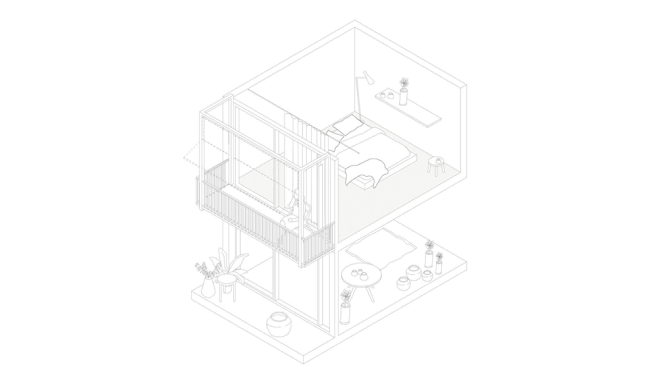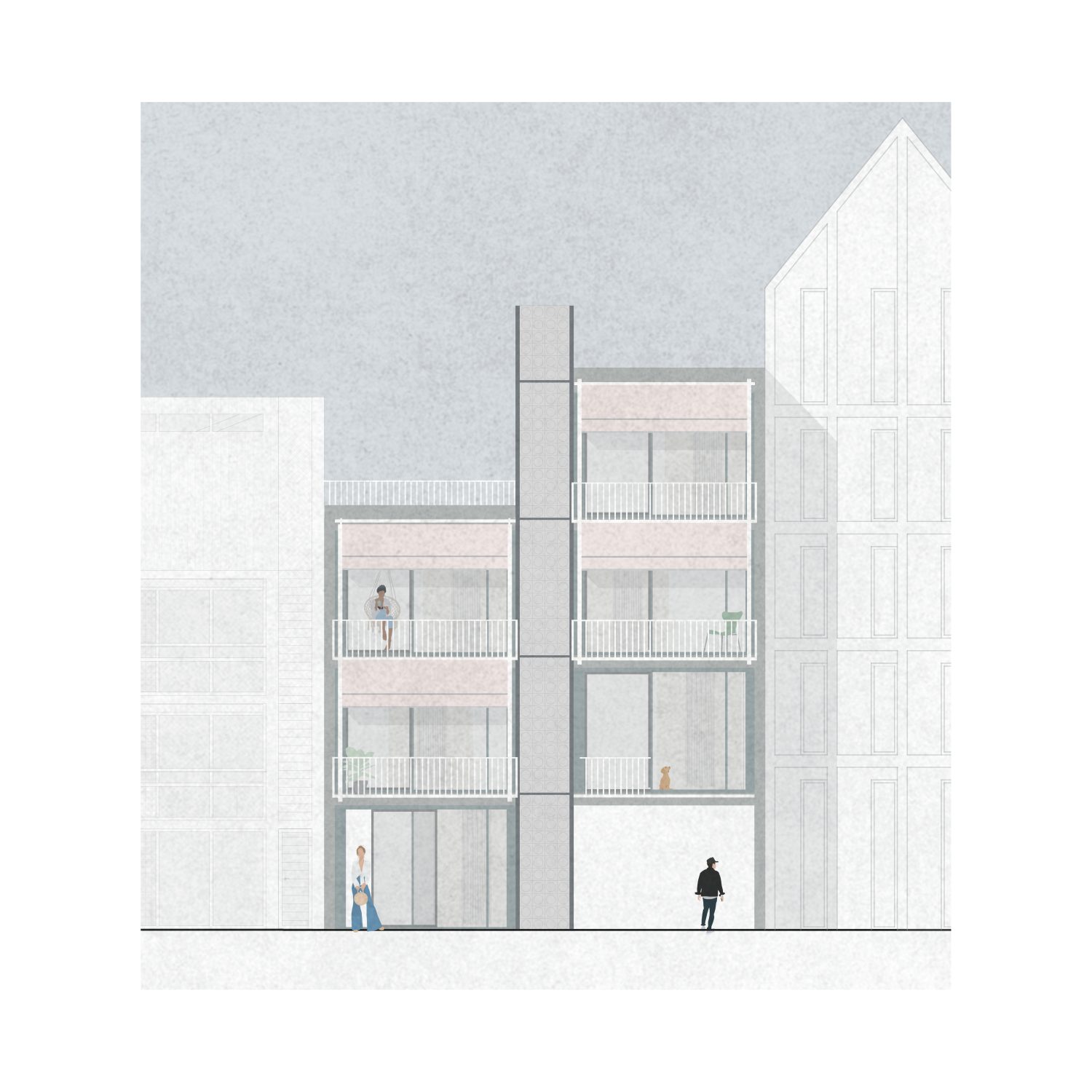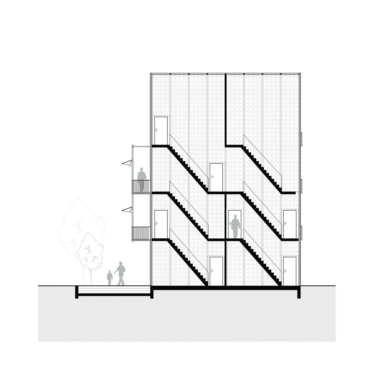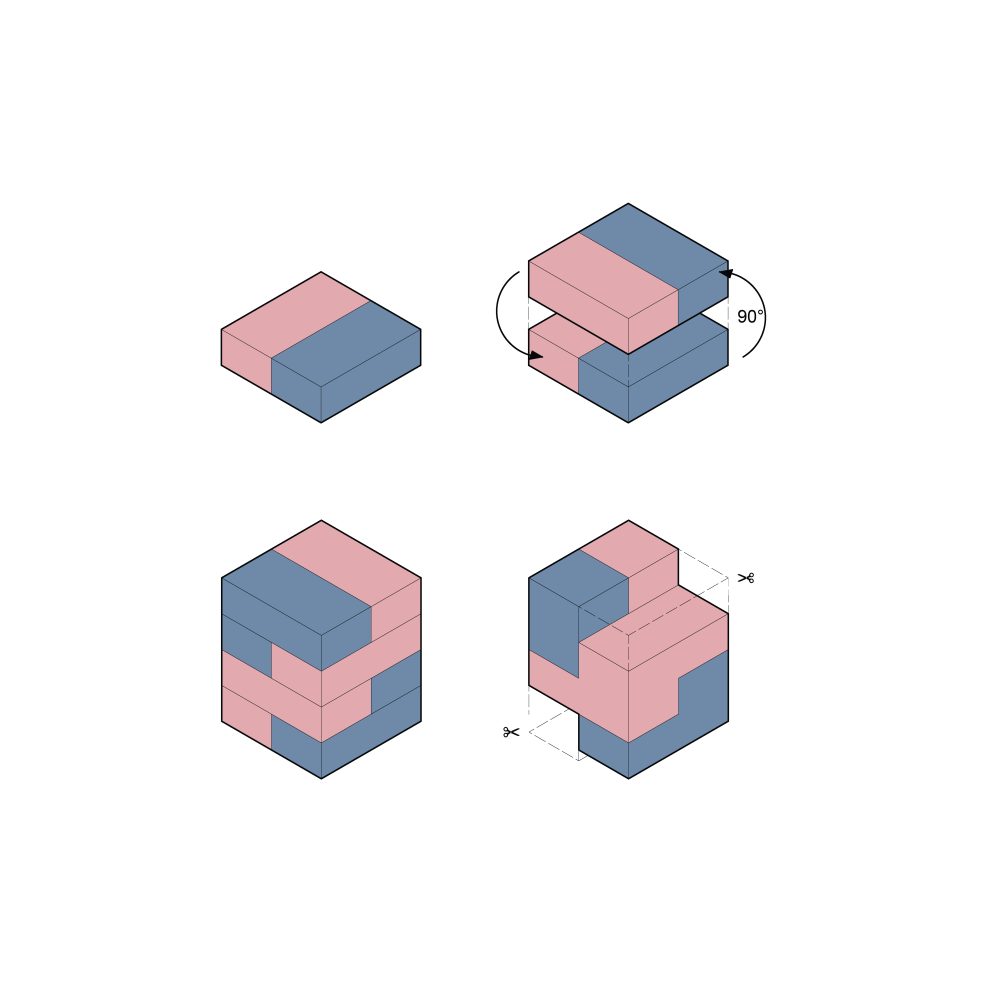 Im Antwerpener Stadtteil Eilandje, einem ehemaligen Hafenareal mit historischen Lagerhallen und zeitgenössischen Wohnstrukturen, befindet sich das Projekt »90GRAD«. Das Gebäude entwickelt sich auf einer Grundfläche von ca. 112 m² über drei Ebenen mit Dachterrasse und nutzt seine Parzelle innerhalb des gemeinschaftlich gedachten Blockrands maximal aus. Der Baukörper gliedert sich in drei vertikale Zonen, getrennt durch ein mittig liegendes Treppenhaus. Der östliche Teil ist im Erdgeschoss vom Boden abgehoben und bildet einen überdachten Außenraum als Fahrradstellplatz und Durchgang zum rückwärtigen Garten. Der Haupteingang liegt an der Nordseite, während vorgestellte Balkone im Süden den Wohnraum erweitern und die Orientierung zum Sonnenlicht sowie zum Gemeinschaftsgarten stärken. Das innere Raumkonzept folgt dem namensgebenden Prinzip »90 Grad«, durch das sich die Wohnstruktur des Doppelhauses ergibt. Ausgehend vom Erdgeschoss rotiert jede Wohneinheit pro Geschoss um ein Viertel um den Treppenkern. Diese Verschiebung erzeugt eine dynamische, abwechslungsreiche Raumstruktur mit klarer Trennung. Die Erschließung erfolgt über versetzte, einläufige Treppenläufe, sodass sich die beiden Parteien im Alltag kaum begegnen – ein subtiler Beitrag zur Privatsphäre im dichten städtischen Kontext.