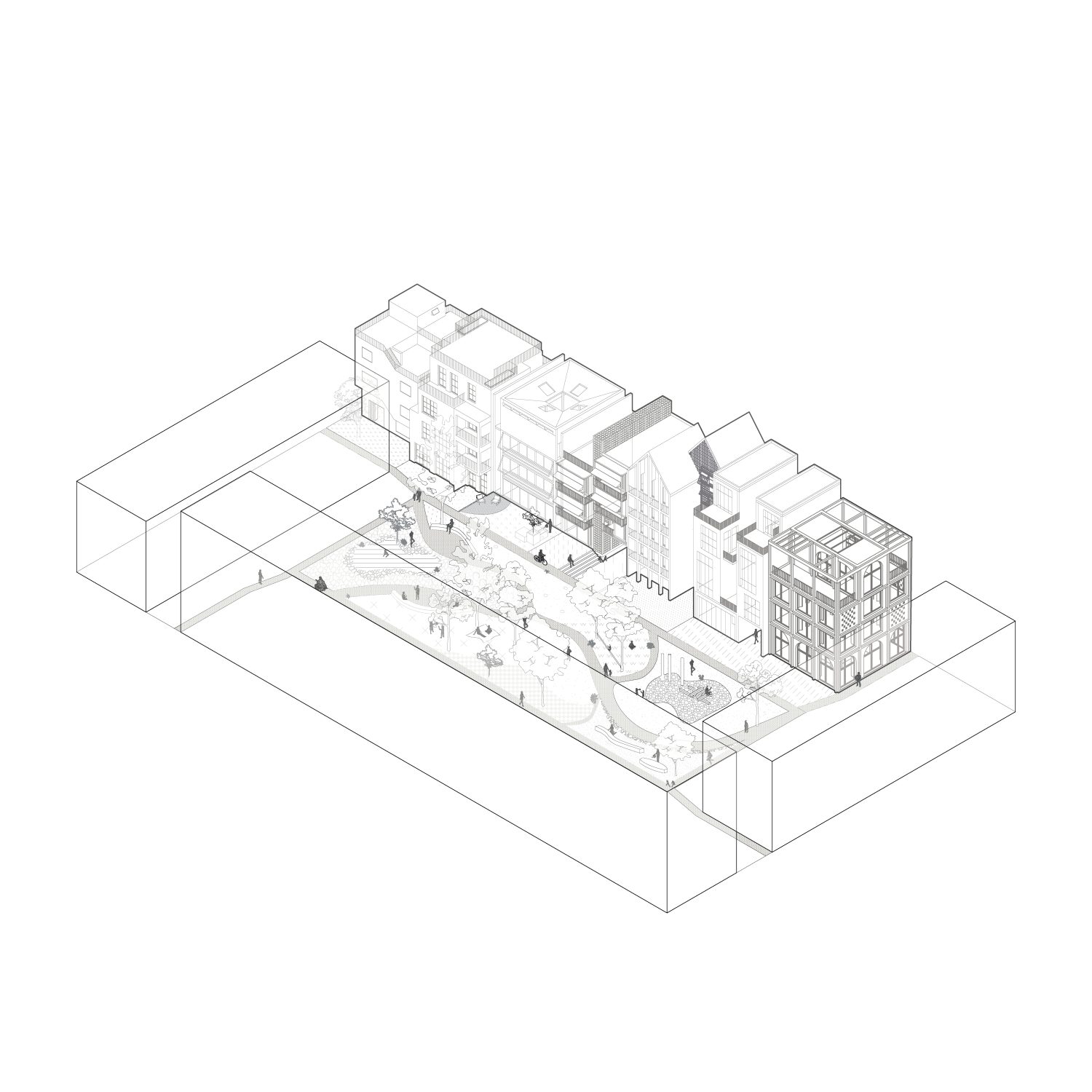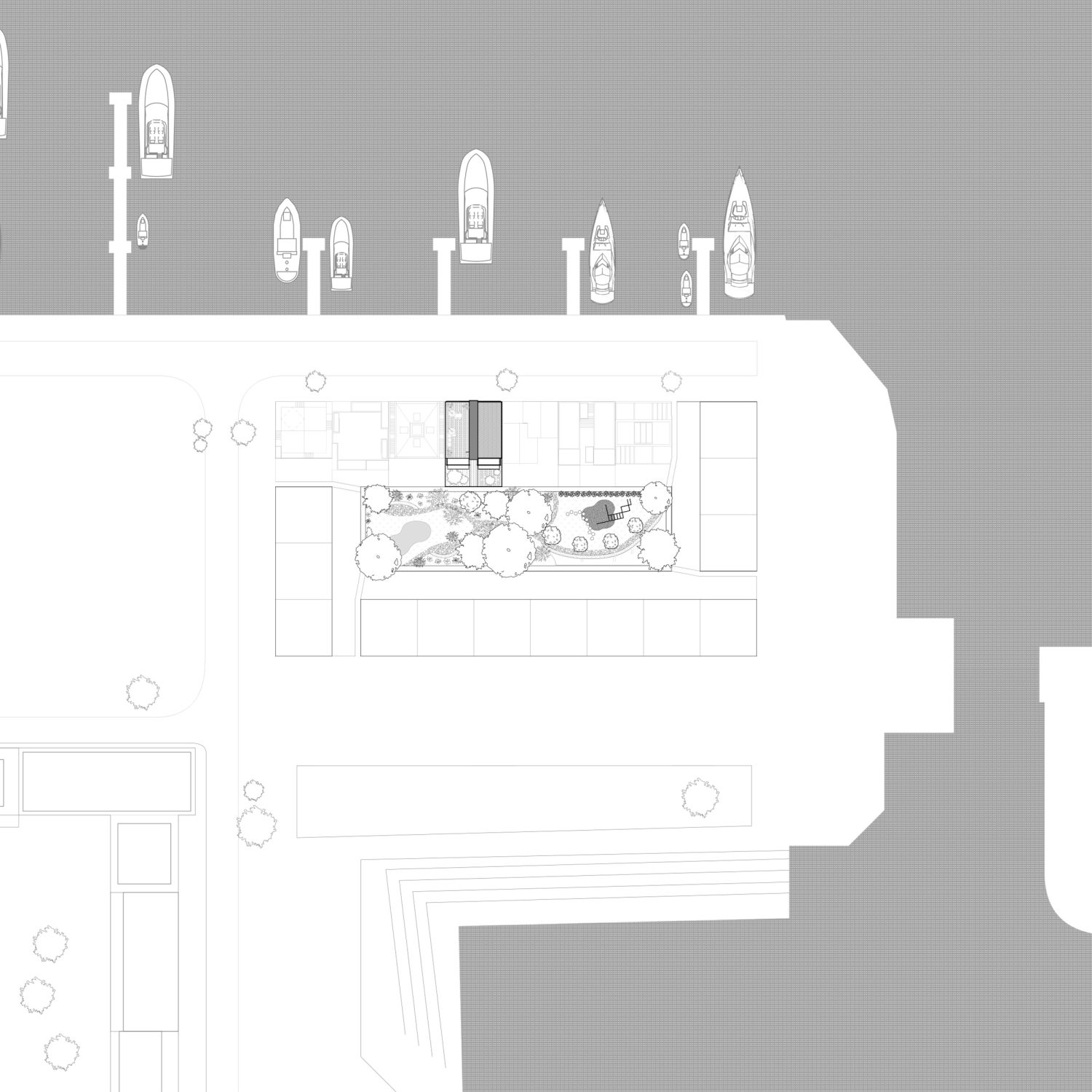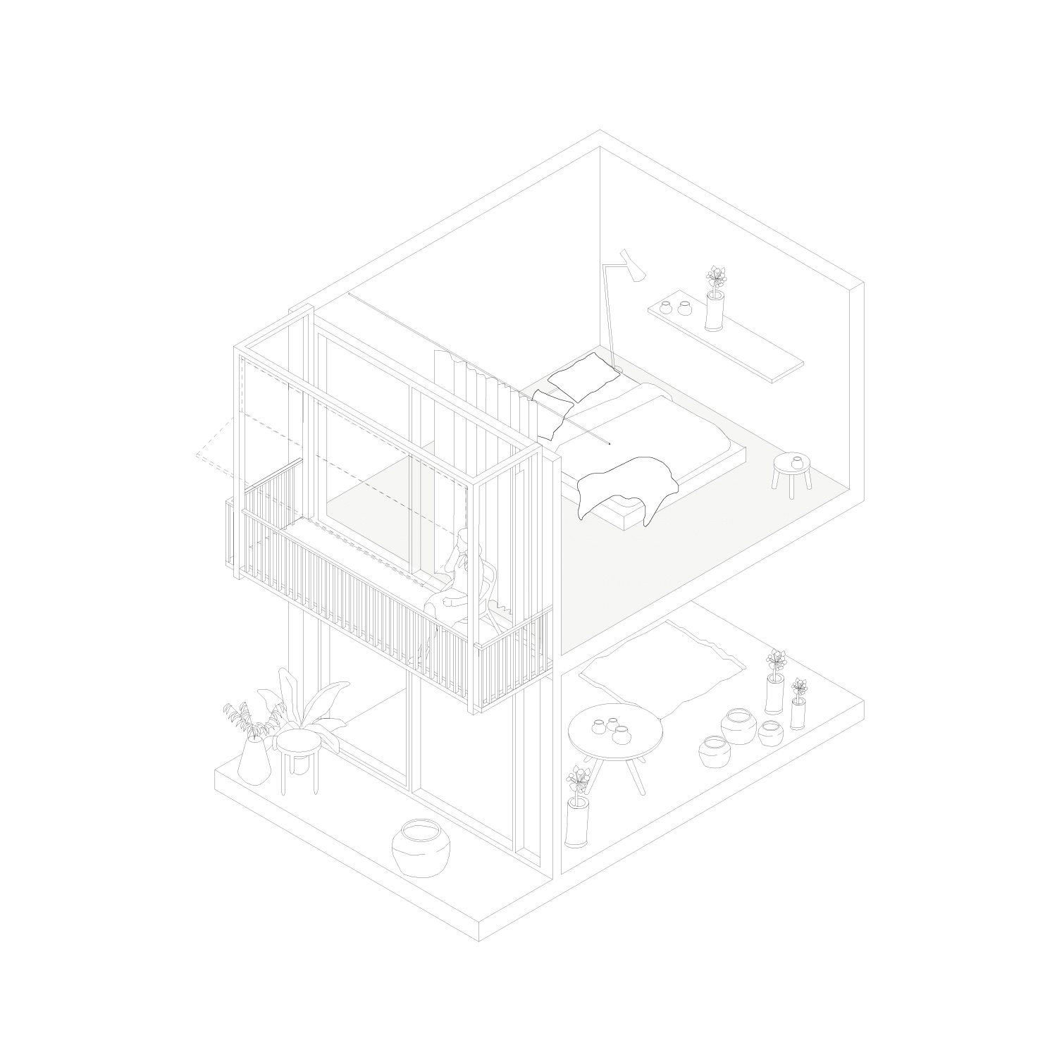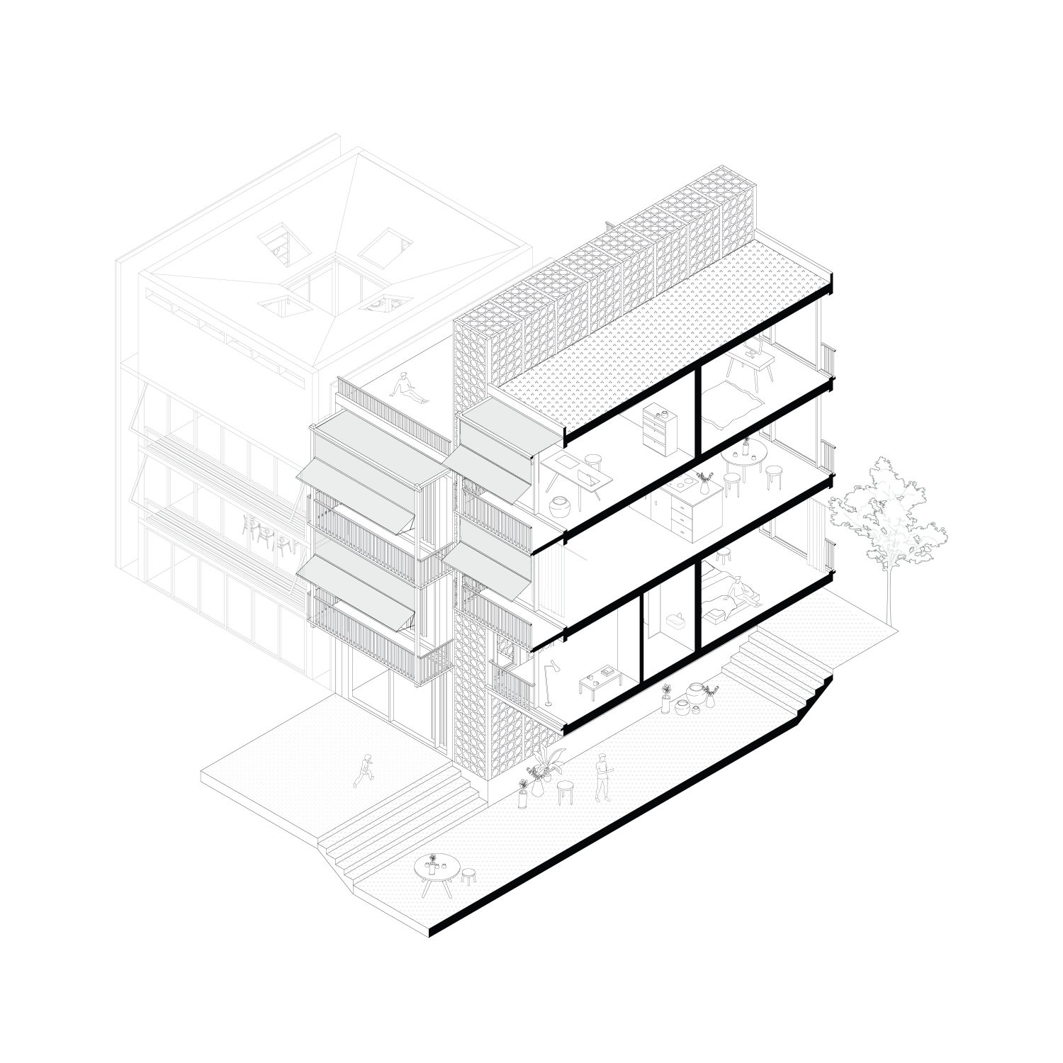 Im Antwerpener Stadtteil Eilandje, einem ehemaligen Hafenareal mit historischen Lagerhallen und zeitgenössischen Wohnstrukturen, befindet sich das Projekt »90GRAD«. Das Gebäude entwickelt sich auf einer Grundfläche von ca. 112 m² über drei Ebenen mit Dachterrasse und nutzt seine Parzelle innerhalb des gemeinschaftlich gedachten Blockrands maximal aus. Der Baukörper gliedert sich in drei vertikale Zonen, getrennt durch ein mittig liegendes Treppenhaus. Der östliche Teil ist im Erdgeschoss vom Boden abgehoben und bildet einen überdachten Außenraum als Fahrradstellplatz und Durchgang zum rückwärtigen Garten. Der Haupteingang liegt an der Nordseite, während vorgestellte Balkone im Süden den Wohnraum erweitern und die Orientierung zum Sonnenlicht sowie zum Gemeinschaftsgarten stärken. Das innere Raumkonzept folgt dem namensgebenden Prinzip »90 Grad«, durch das sich die Wohnstruktur des Doppelhauses ergibt. Ausgehend vom Erdgeschoss rotiert jede Wohneinheit pro Geschoss um ein Viertel um den Treppenkern. Diese Verschiebung erzeugt eine dynamische, abwechslungsreiche Raumstruktur mit klarer Trennung. Die Erschließung erfolgt über versetzte, einläufige Treppenläufe, sodass sich die beiden Parteien im Alltag kaum begegnen – ein subtiler Beitrag zur Privatsphäre im dichten städtischen Kontext.