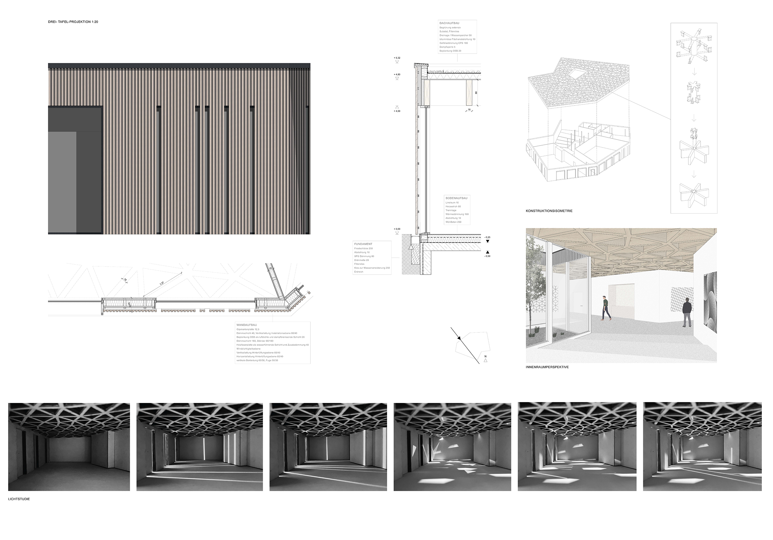 In der Aufgabe sollen die zentralen Themen der Architektur – Lichtführung, Raumproportion, Oberfläche und Materialisierung, Übergang von Innen nach Außen ergründet und mit einem konstruktiven Schwerpunkt in Holzbau umgesetzt werden. Die Topografie des Grundstücks erfordert eine sorgfältige Setzung des Gebäudes.