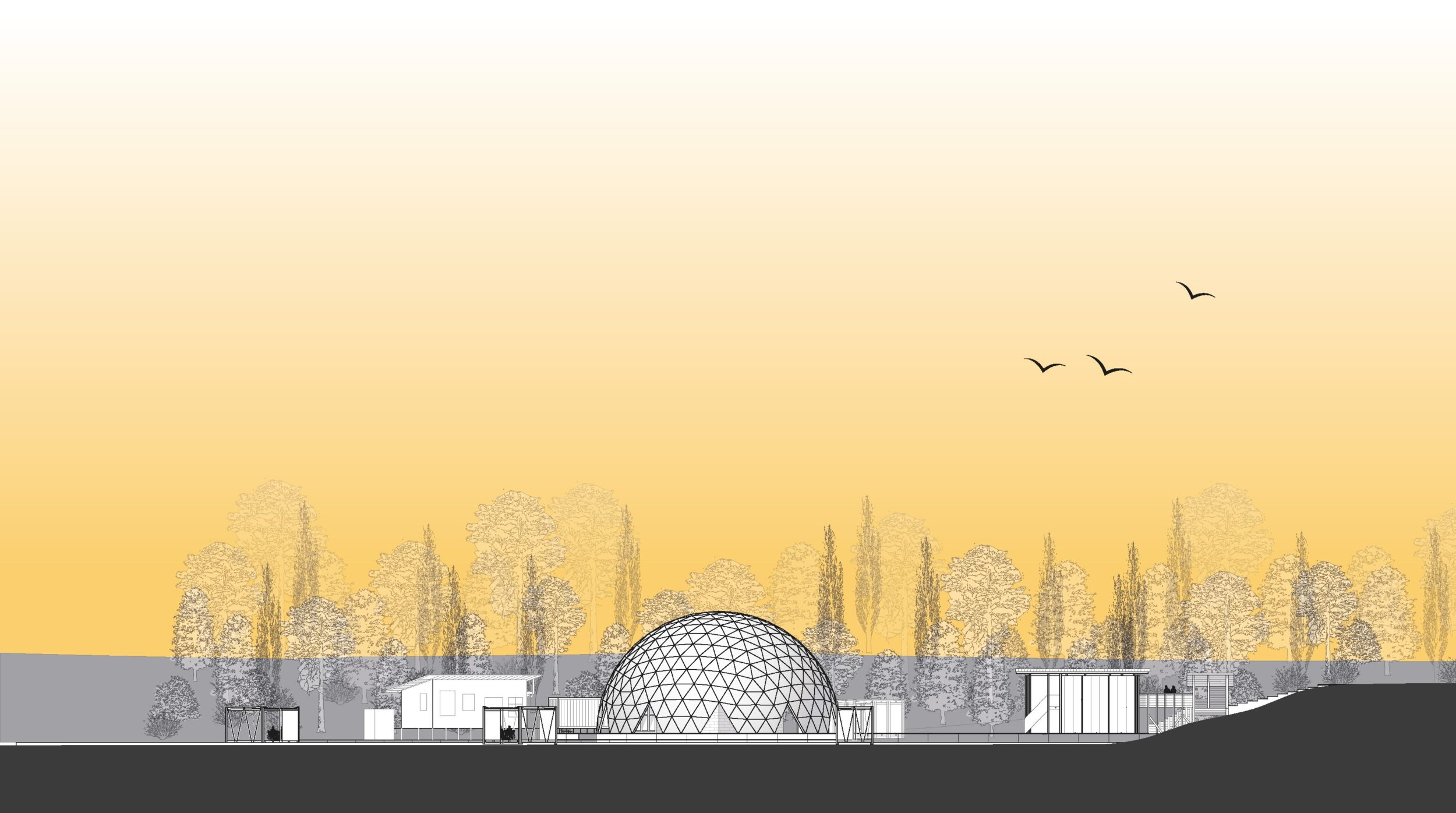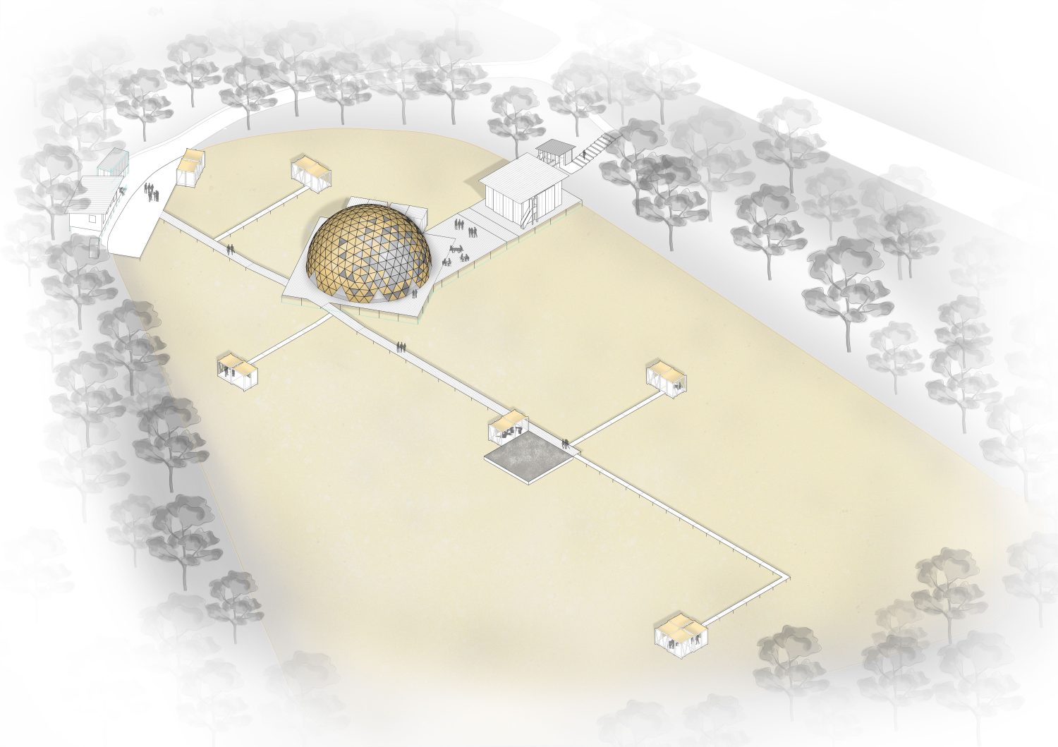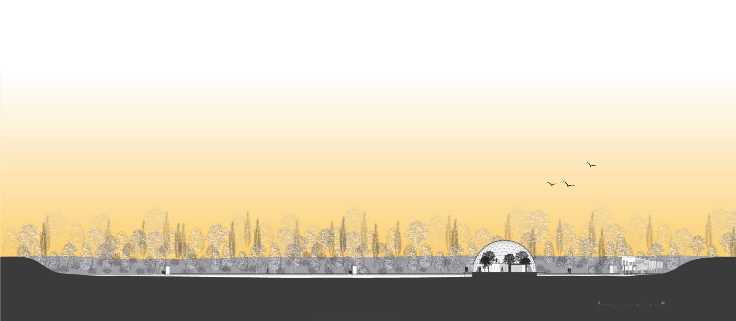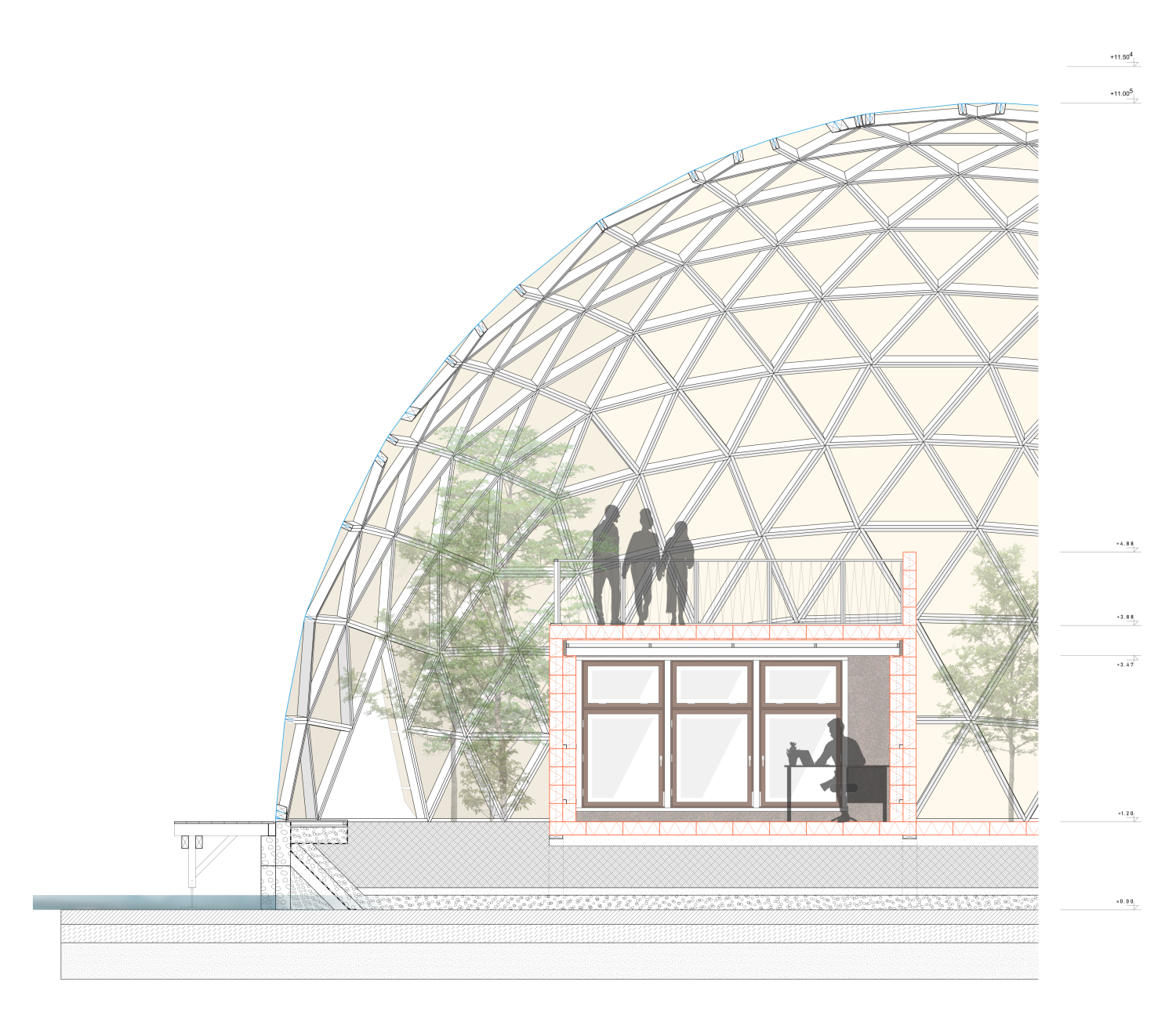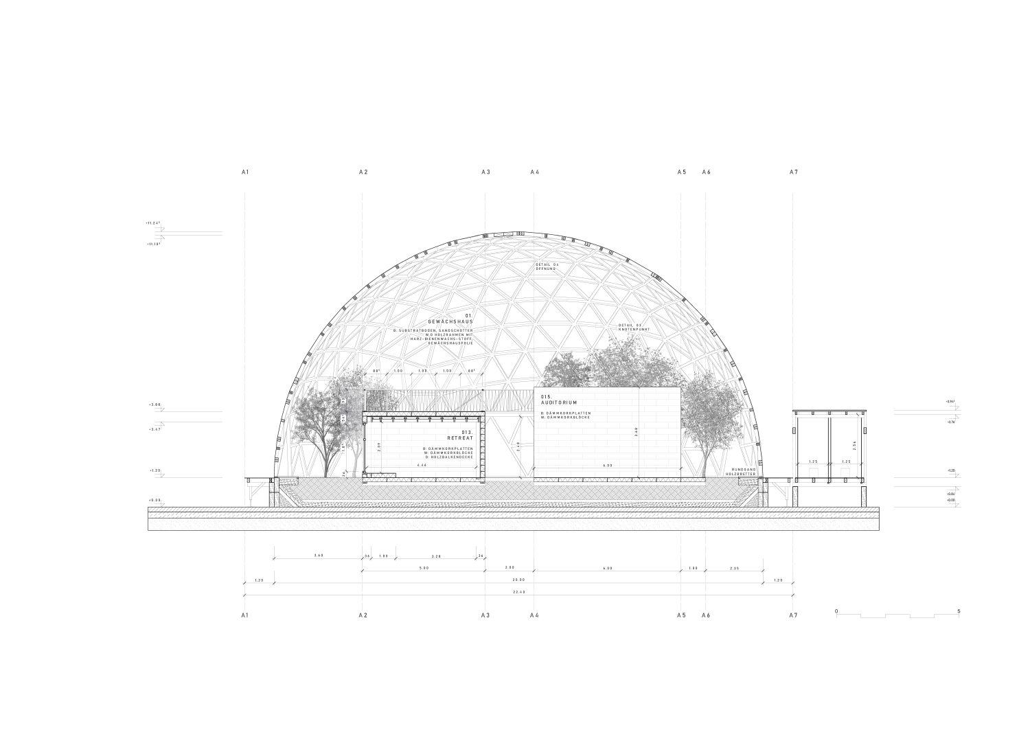 Das soziale Zentrum bietet Schutz durch eine statisch vorteilhafte und materialsparende Kuppel, in der das Gewächshaus, ein Auditorium, eine Küche eine Bar und zwei zusätzliche Warmräume Platz finden. Das Büro und der Retreat. Diese werden aus CO2 negativem Dämmkork gebaut, welcher gleichzeitig tragend, schall- und wärmedämmende Eigenschaften übernimmt. Hinzu kommt die optische Einfügung in die von Pflanzen geprägte Umgebung im Inneren des Gewächshauses und ein angenehm natürlicher Duft.