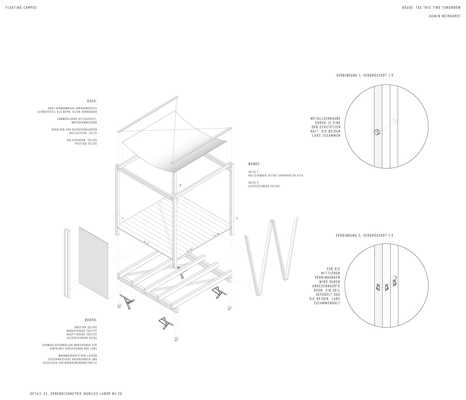Die Floating University befindet sich mit ihrem Standort auf dem Tempelhofer Regenrückhaltebecken auf einem außergewöhnlichen Grundstück. Ein Zusammenspiel aus einem sozialen lebendigen Zentrum und mobilen auf der gesamten Fläche verteilbaren Laboren ermöglicht, dass ebendiese Besonderheit auch aus allen Winkeln und Perspektiven wahrgenommen und erlebt werden kann.
