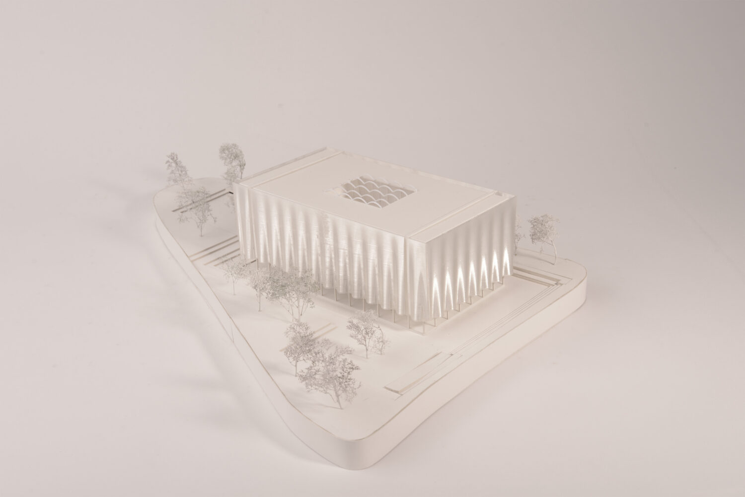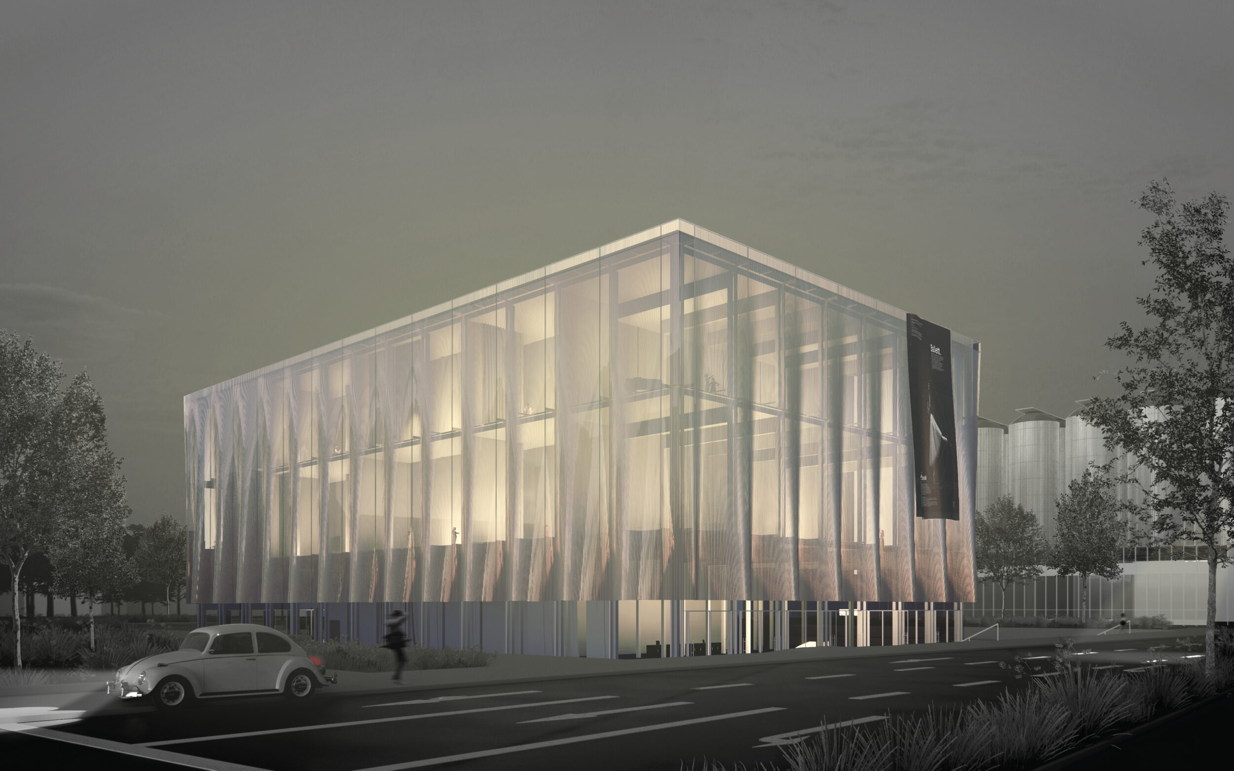 Das Highlight der architektonischen Gestalt bildet die vorgehängte Glasfassade, die zu unterschiedlichen Tageszeiten für ein Lichtspiel sorgt und zusätzlich den Bezug von Innen nach Außen vermittelt. Durch die gewählte Bauweise entsteht ein spannendes Verhältnis zwischen der Massivität des Solitärs und der Filigranität der Konstruktion, sowie Licht und Schatten, Verborgenheit und Transparenz.