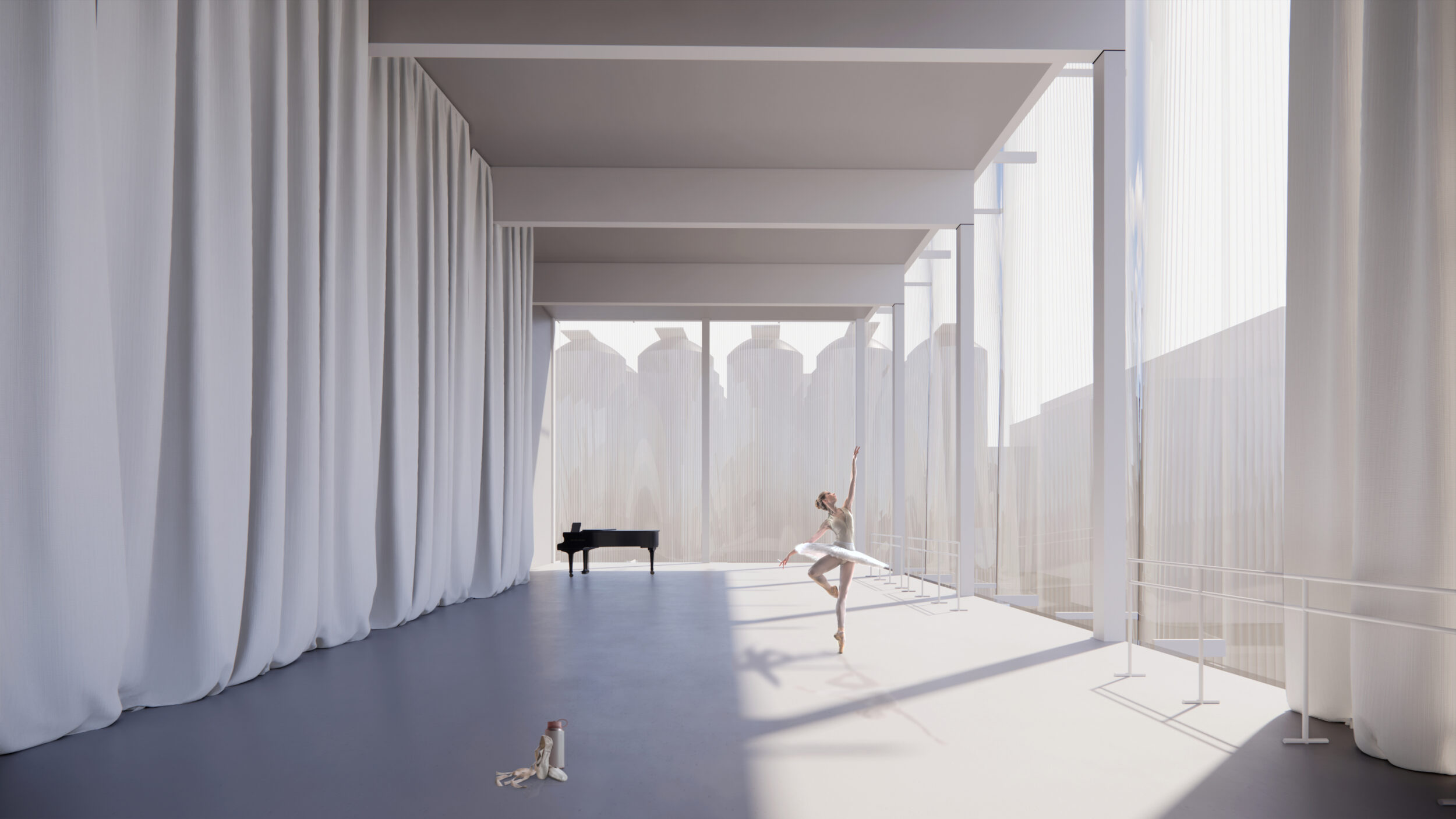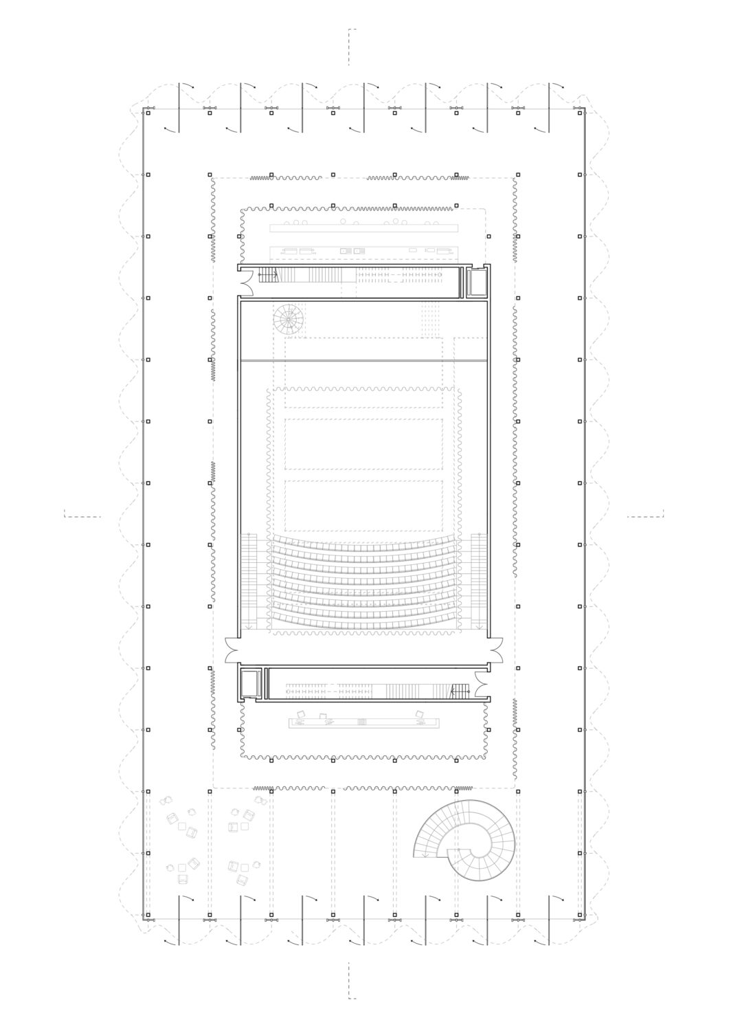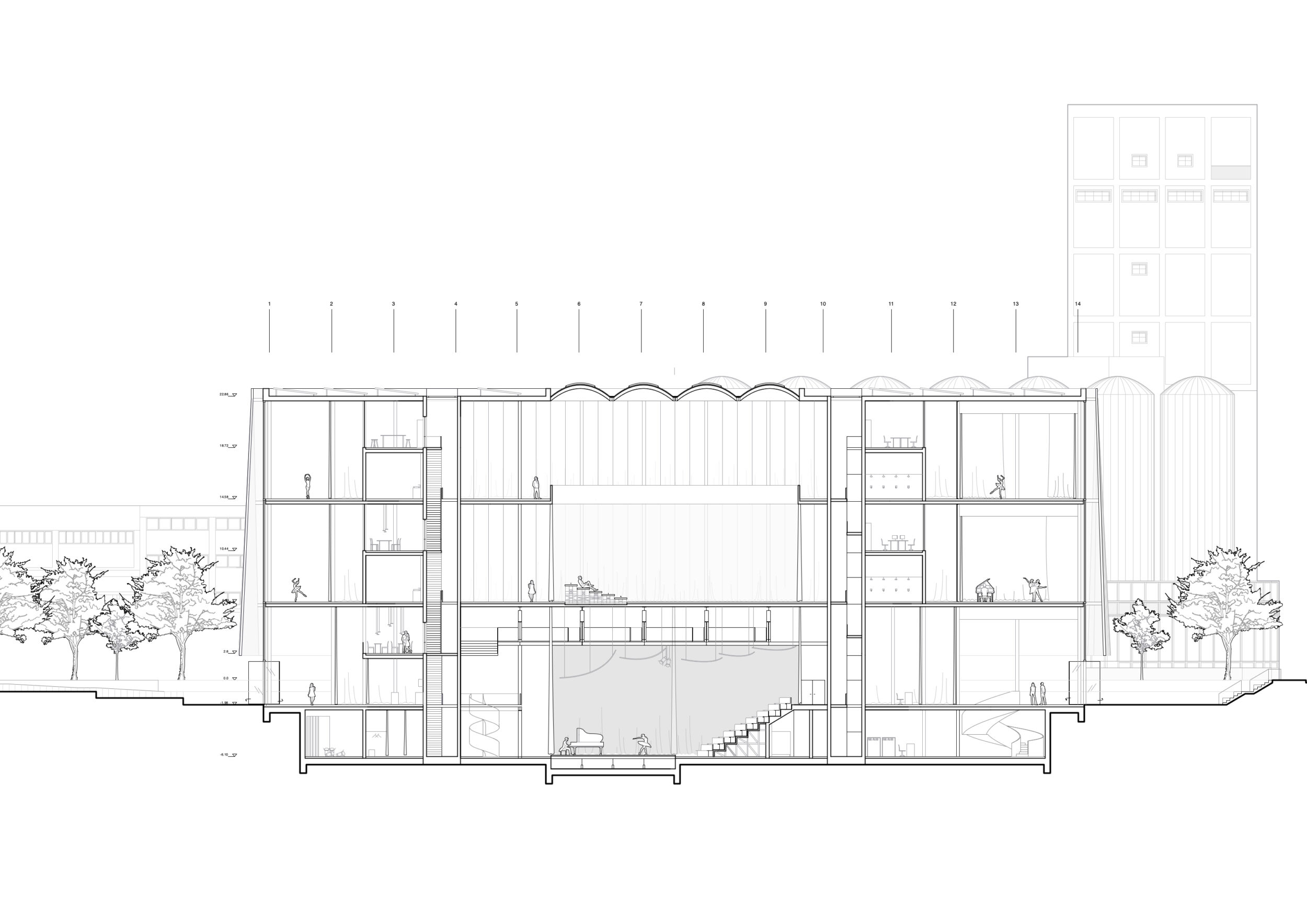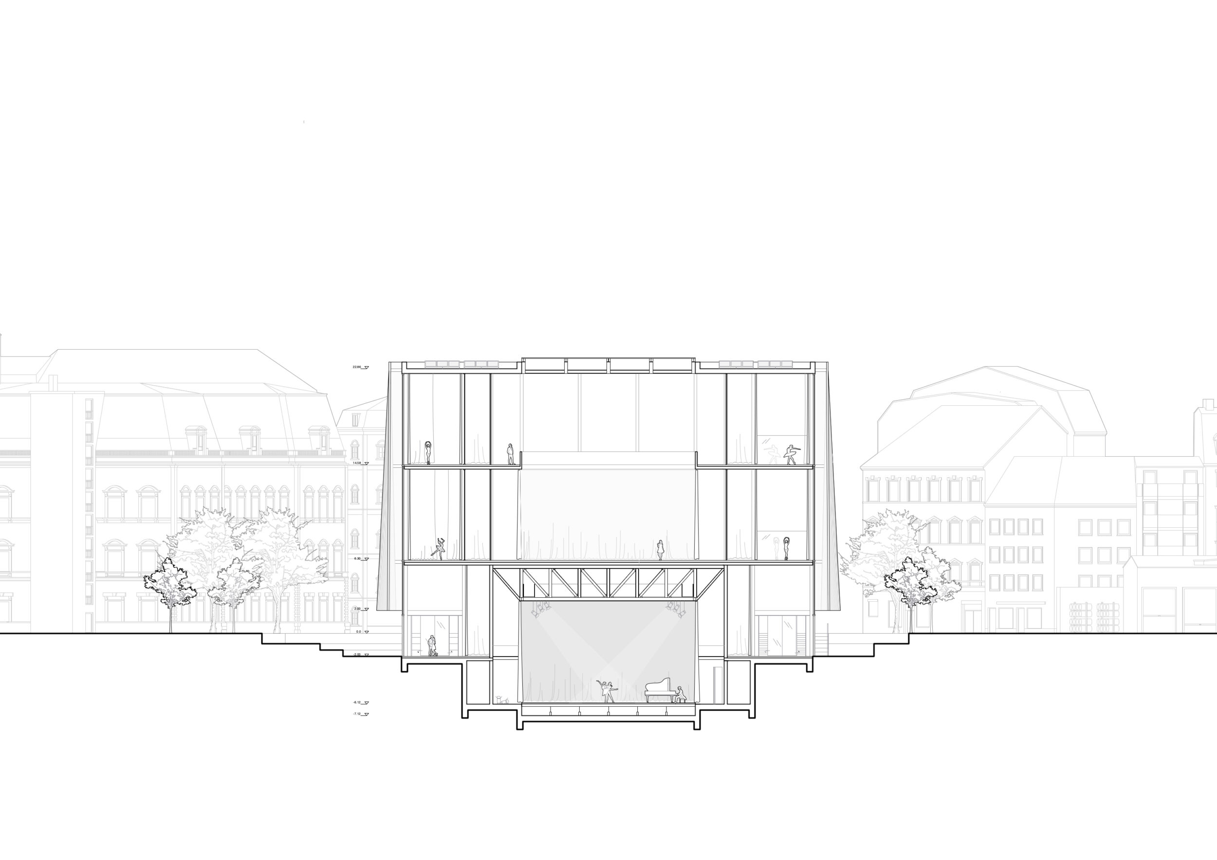 Die Bühne funktioniert in unserer räumlichen Idee als zentrales Moment und als Schnittstelle zwischen öffentlich und halböffentlich. Die Räume der École sortieren sich schichtweise um das Bühnenzentrum, dass das Herzstück des Solitär bildet. Durch das Verwenden von Vorhängen entsteht eine hohe Nutzerindividualität und Flexibilität. Das offene Raumkonzept schafft somit eine gemeinschaftliche Arbeitsatmosphäre für die unterschiedlichen Nutzergruppen und bietet unterschiedliche Plattformen für lebendigen Austausch untereinander.