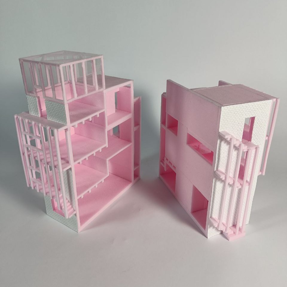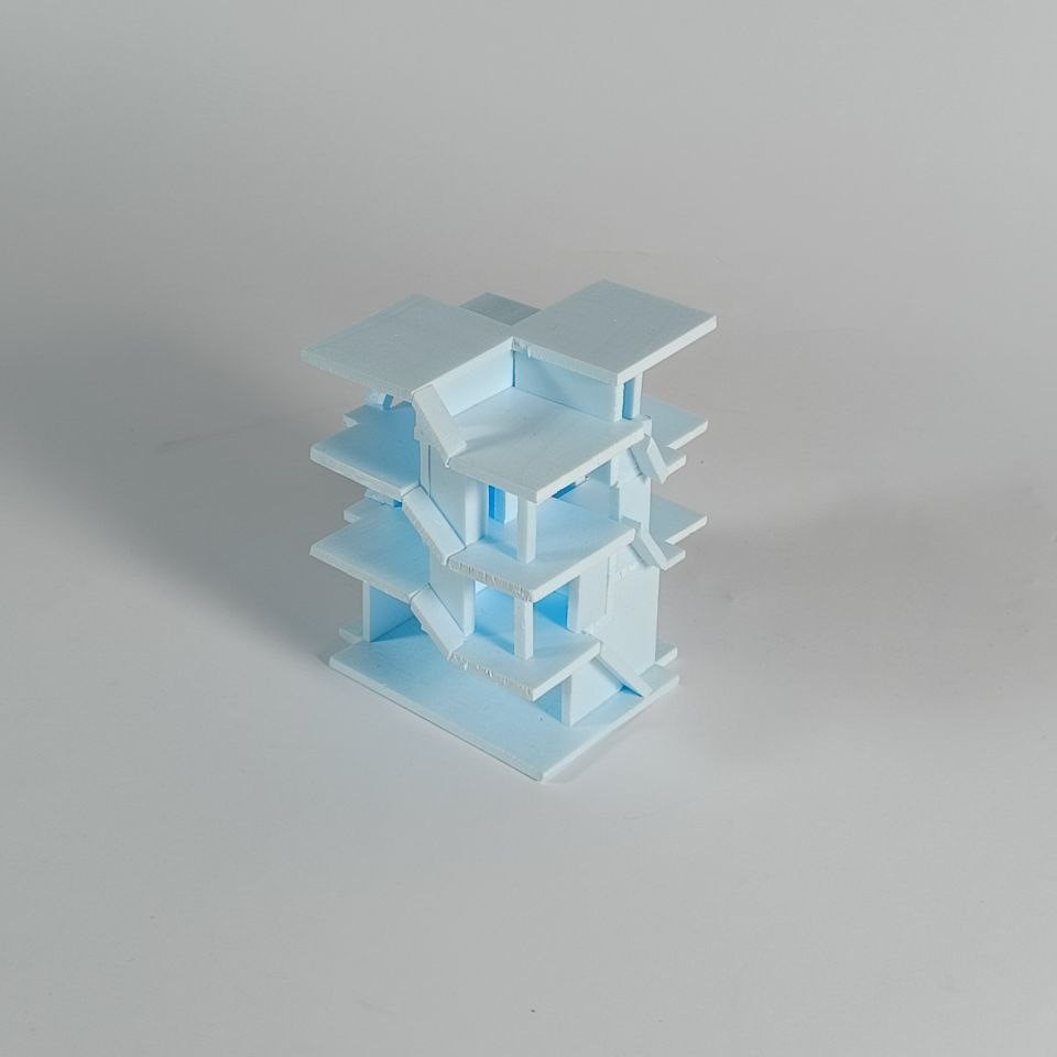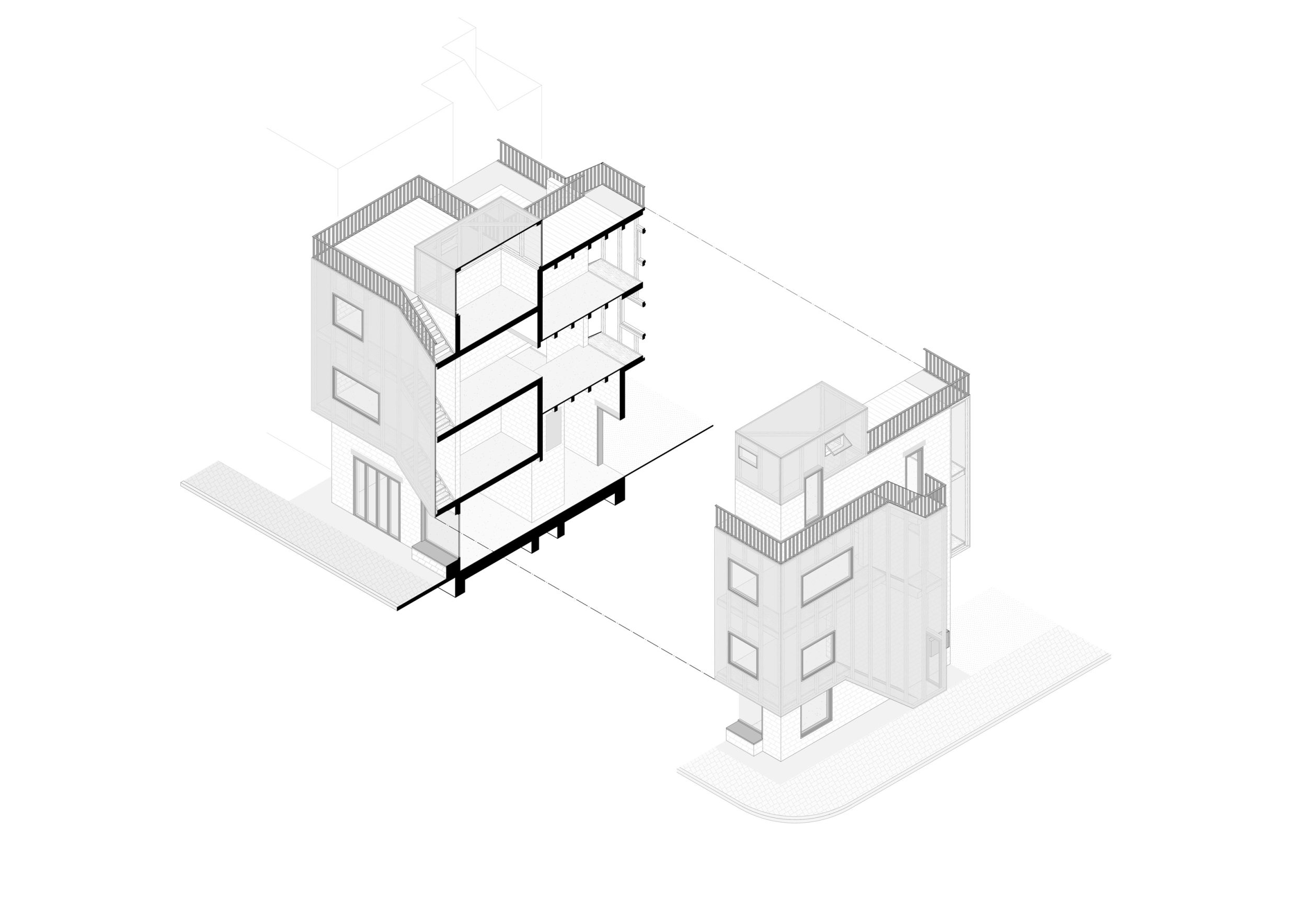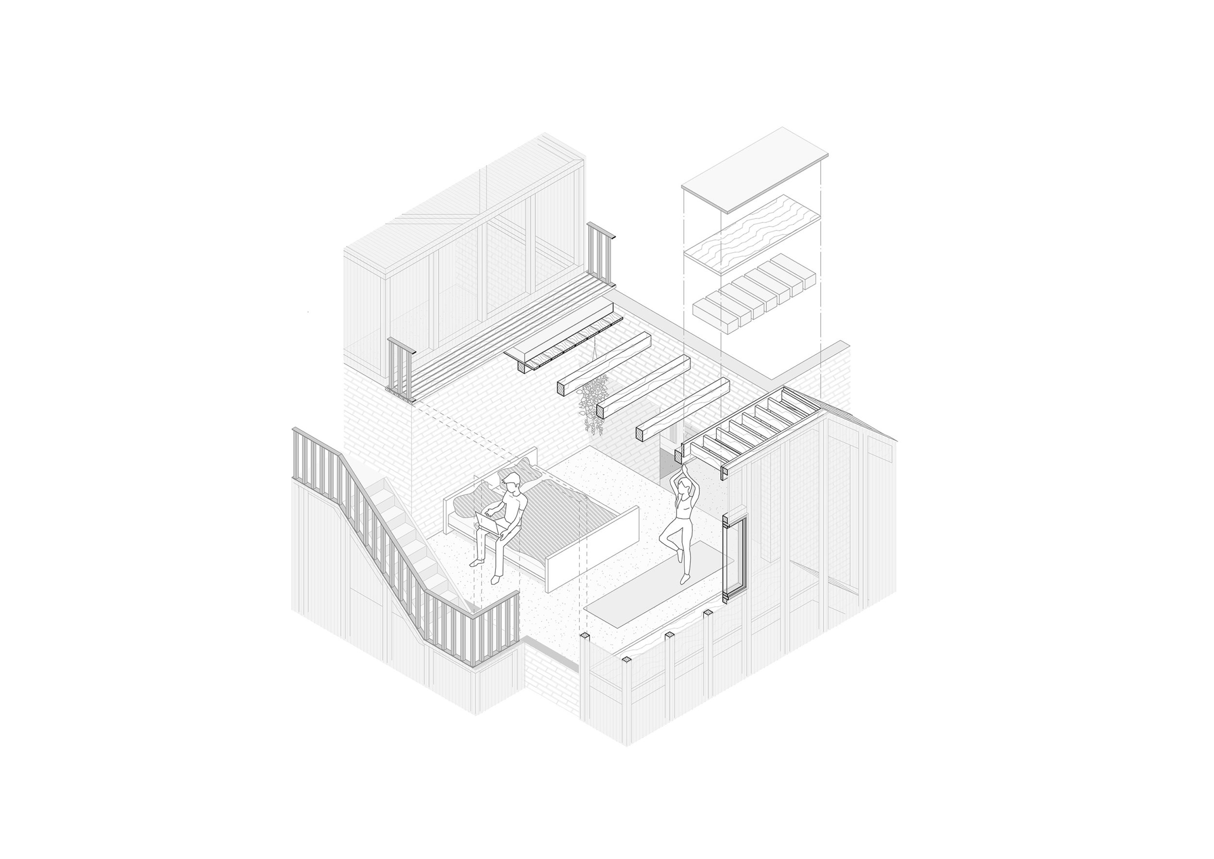In den darüber liegenden Geschossen befinden sich zwei Wohneinheiten, welche unabhängig voneinander und von zwei Seiten erschließbar sind. Diese greifen spiralförmig ineinander und verweben sich über zwei gesplittete Geschosse hinweg miteinander und erschließen auch das Dach. Dieses wird sowohl als Terrassenfläche genutzt sowie mit einem, für eine Partei zugänglichem, Gartenhaus bespielt. Durch die offenen Sichtachsen von Ebenen zu Ebene entsteht ein fließender Raum, welcher jede Wohneinheit in einem Raumkontinuum erscheinen lässt und somit eine offene und kommunikative Wohnatmosphäre schafft.