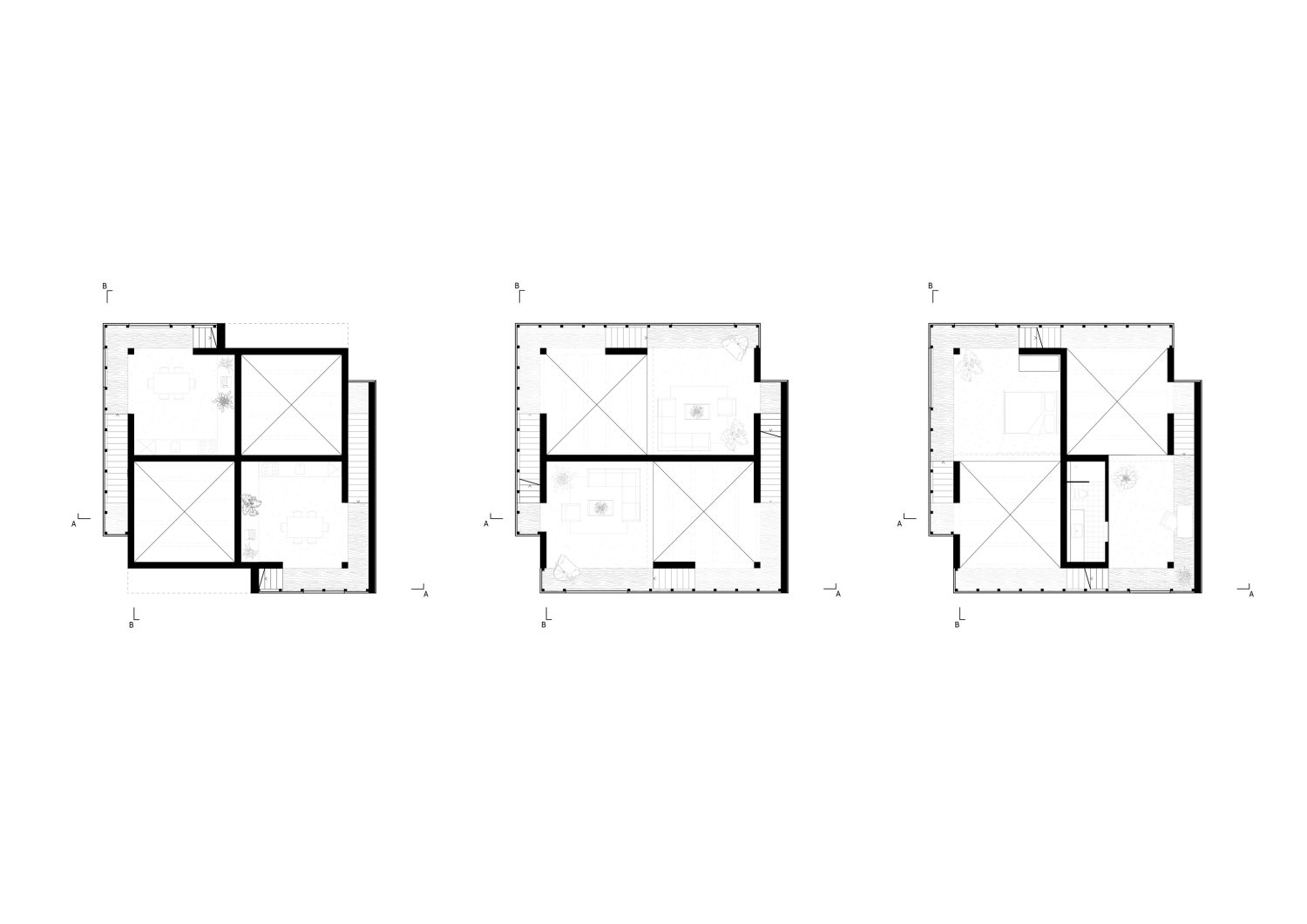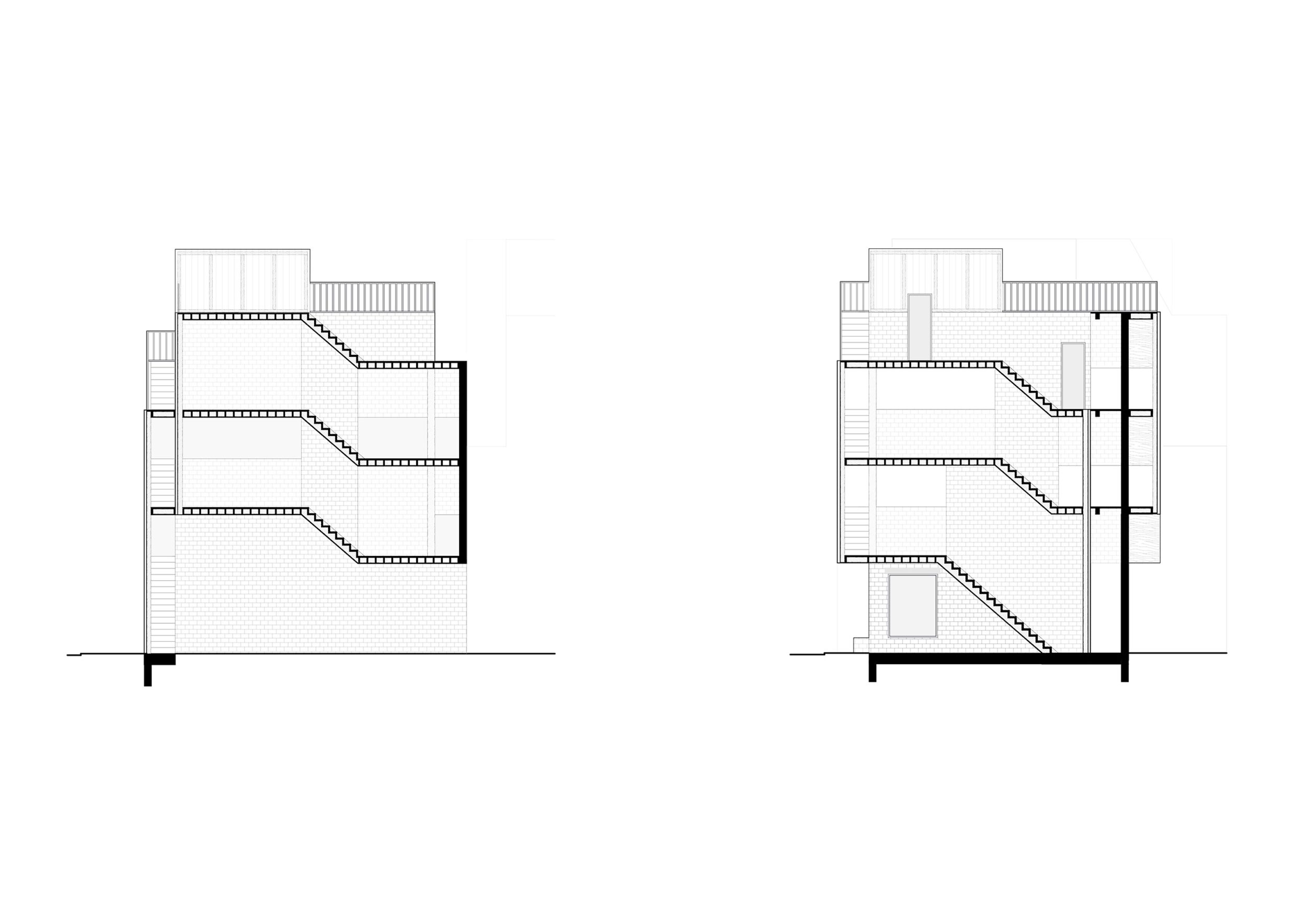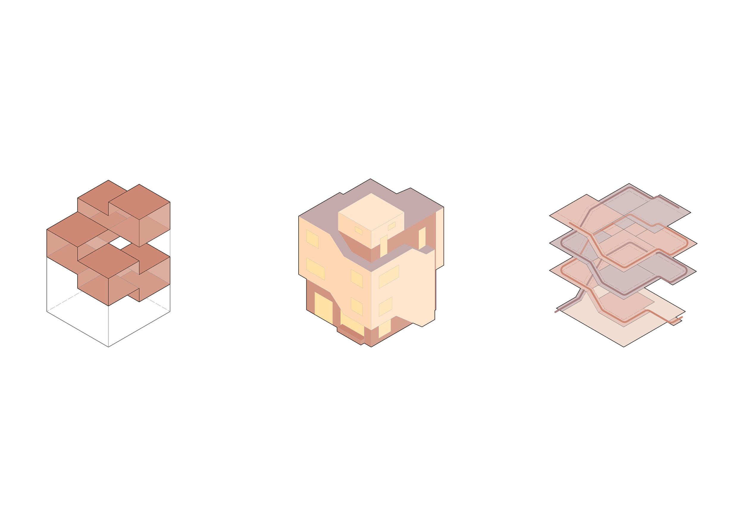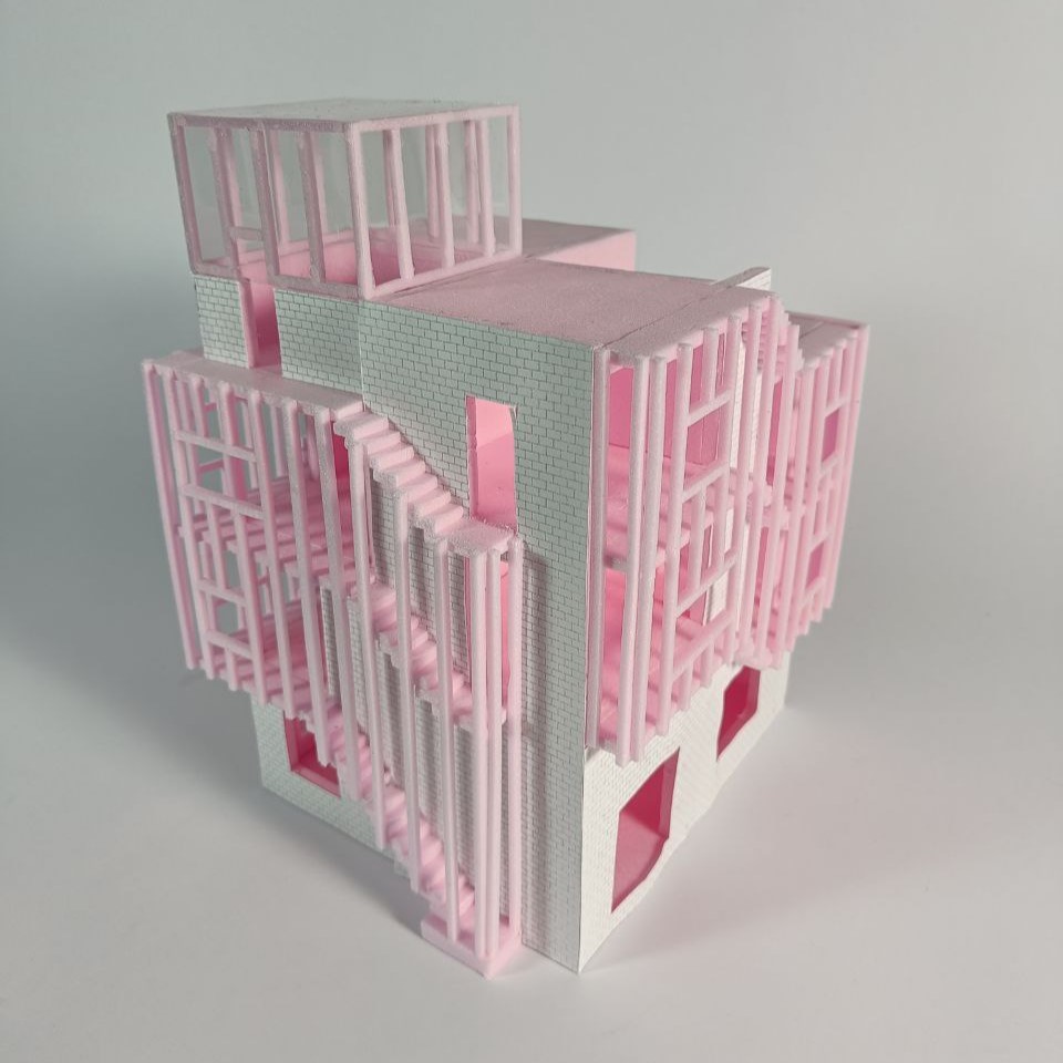 In den darüber liegenden Geschossen befinden sich zwei Wohneinheiten, welche unabhängig voneinander und von zwei Seiten erschließbar sind. Diese greifen spiralförmig ineinander und verweben sich über zwei gesplittete Geschosse hinweg miteinander und erschließen auch das Dach. Dieses wird sowohl als Terrassenfläche genutzt sowie mit einem, für eine Partei zugänglichem, Gartenhaus bespielt. Durch die offenen Sichtachsen von Ebenen zu Ebene entsteht ein fließender Raum, welcher jede Wohneinheit in einem Raumkontinuum erscheinen lässt und somit eine offene und kommunikative Wohnatmosphäre schafft.