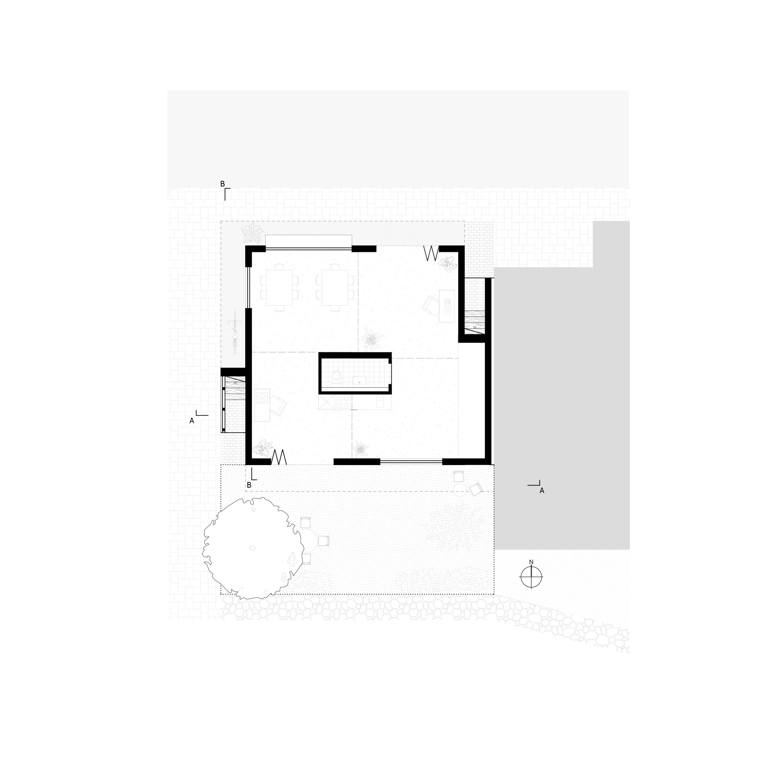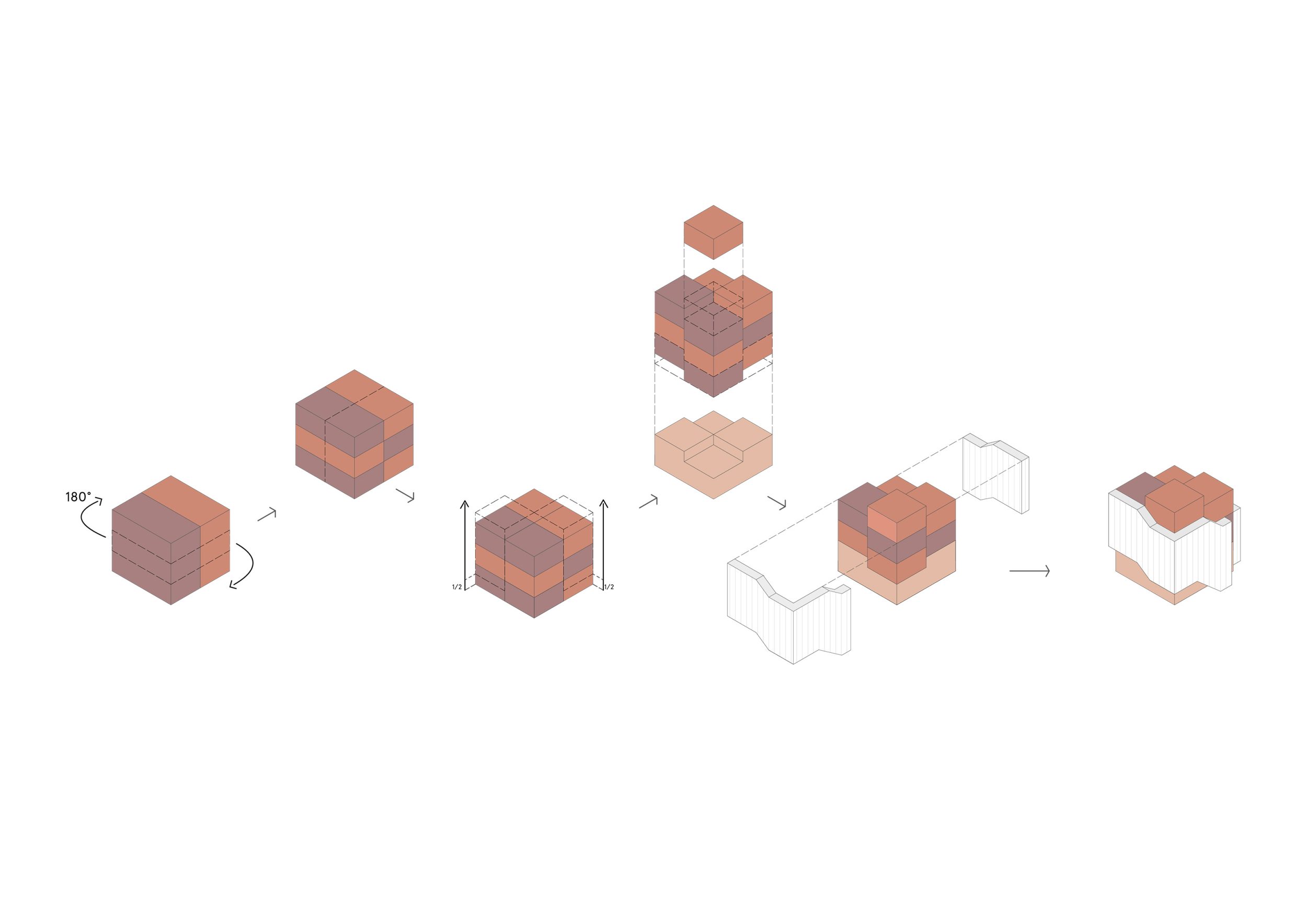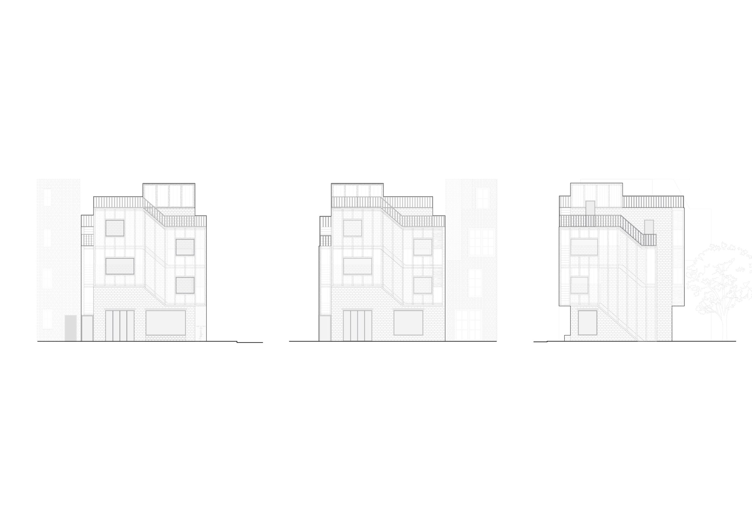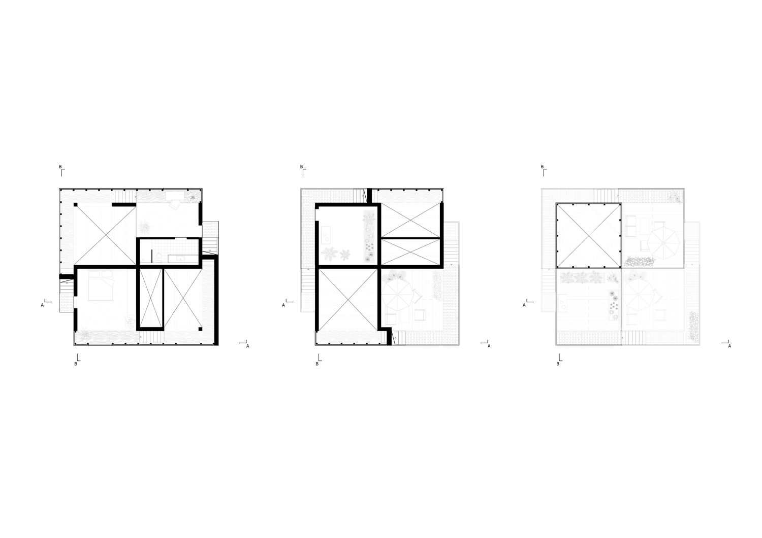 In den darüber liegenden Geschossen befinden sich zwei Wohneinheiten, welche unabhängig voneinander und von zwei Seiten erschließbar sind. Diese greifen spiralförmig ineinander und verweben sich über zwei gesplittete Geschosse hinweg miteinander und erschließen auch das Dach. Dieses wird sowohl als Terrassenfläche genutzt sowie mit einem, für eine Partei zugänglichem, Gartenhaus bespielt. Durch die offenen Sichtachsen von Ebenen zu Ebene entsteht ein fließender Raum, welcher jede Wohneinheit in einem Raumkontinuum erscheinen lässt und somit eine offene und kommunikative Wohnatmosphäre schafft.