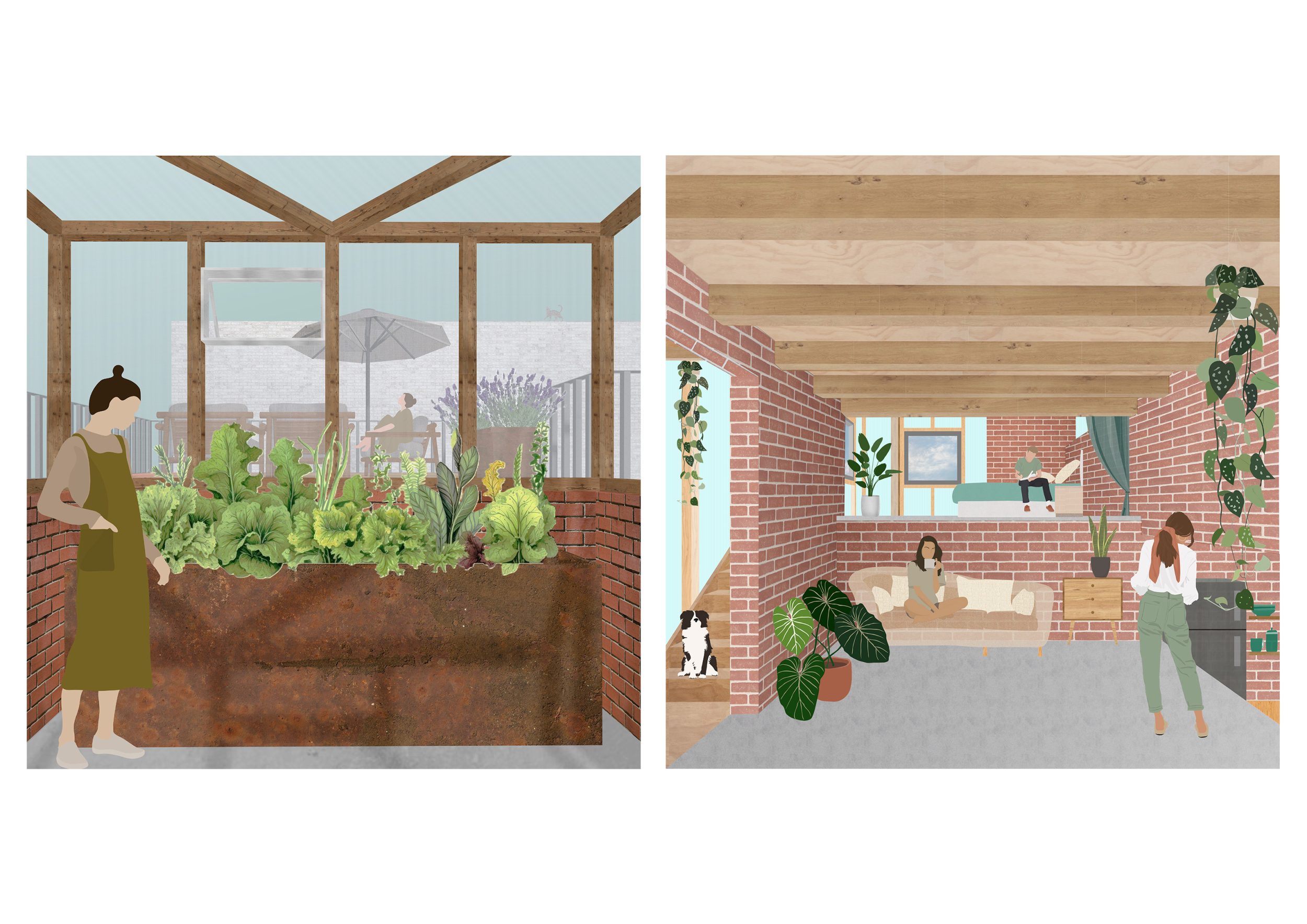 Der Gegensatz der massiven Backsteine und der leichten Holz-Polycarbonat-Konstruktion geben dem Gebäude auch in seiner Materialität einen besonderen Ausdruck. Das Zusammenspiel der Materialien findet sich auch in den Bodenbelägen der Innen- und Außenräume wieder, welche den Wechsel zwischen der Massiven Struktur aus Backstein und der skelettartigen Struktur des Holzanbaus widerspiegeln.