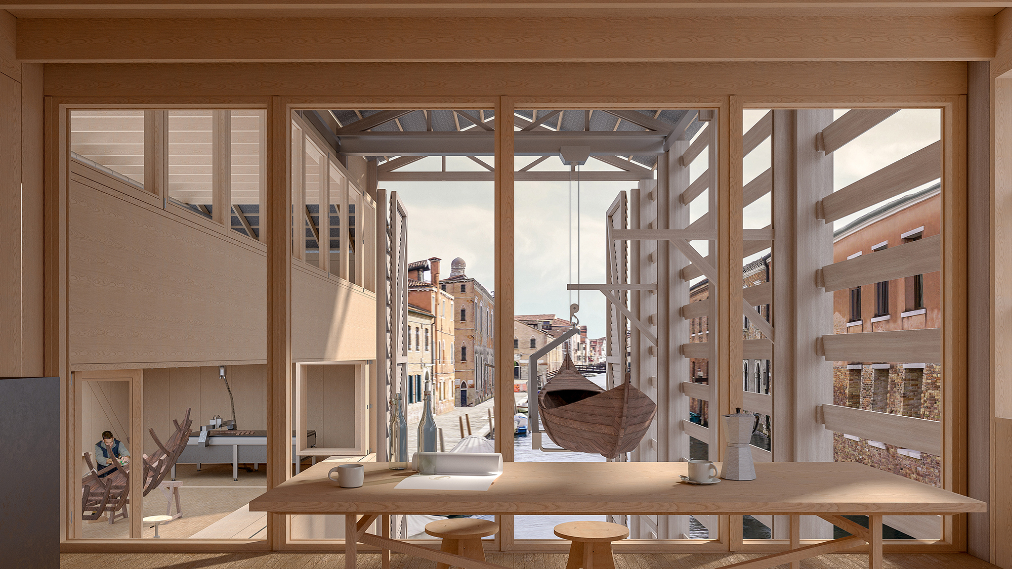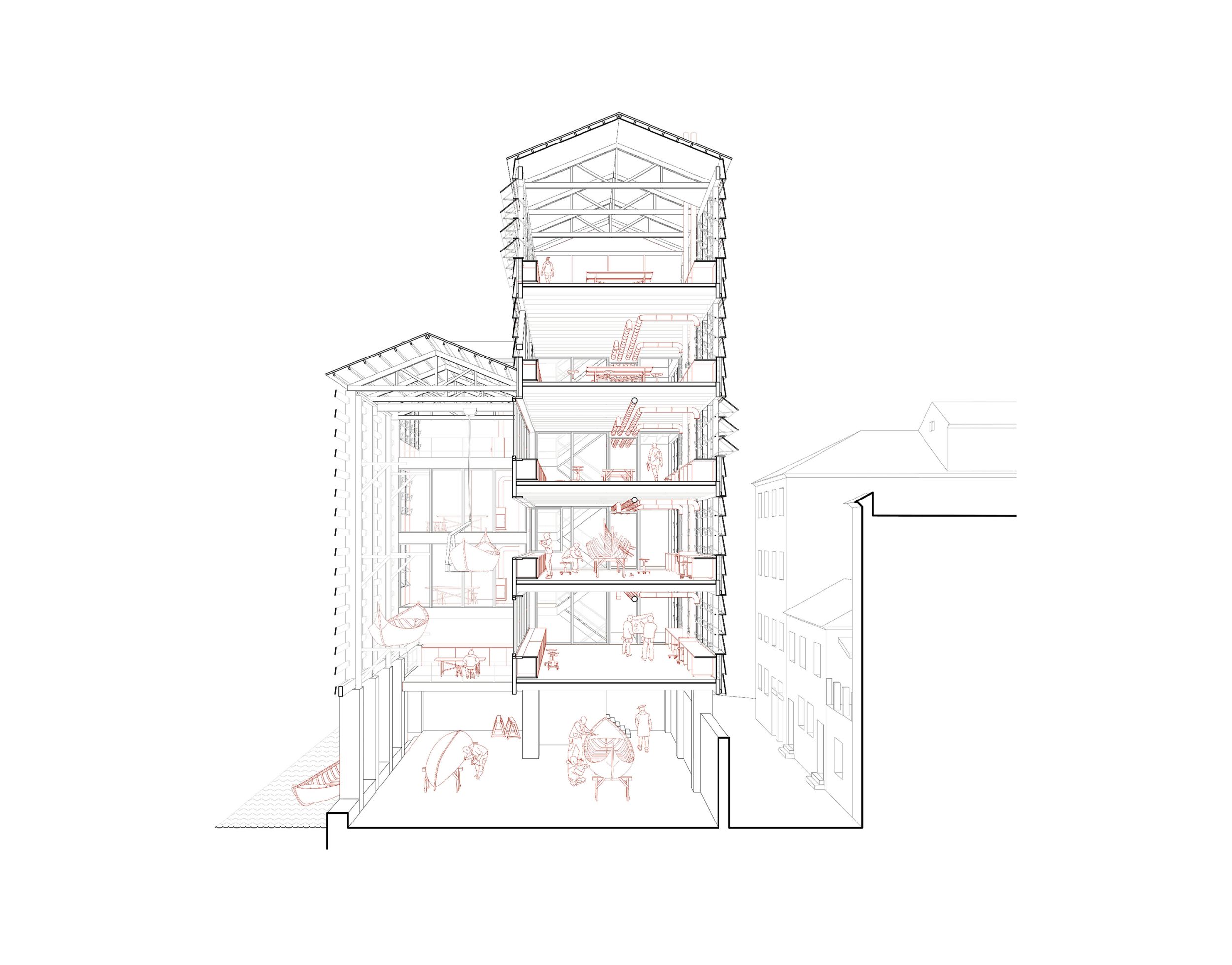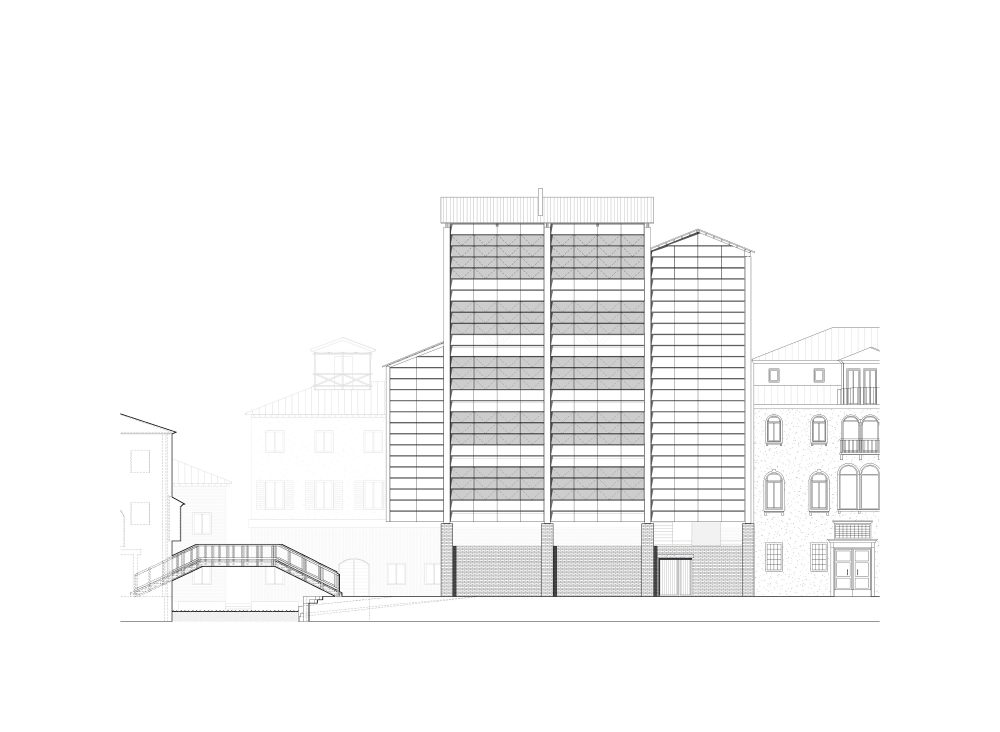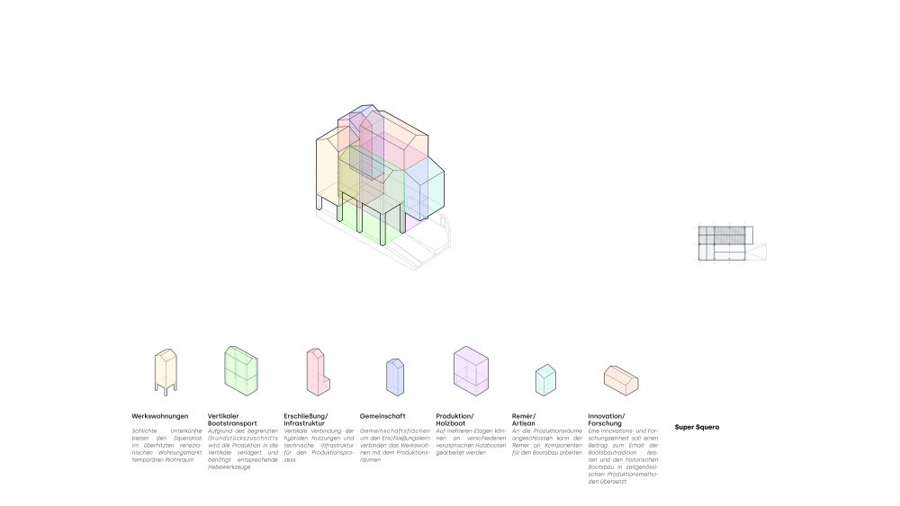 In der Peripherie des Sestiere Cannaregio, die sich den Touristenströmen etwas entzieht, wird an einigen wenigen Orten das traditionelle Handwerk und die Rudertechnik wieder erlernt. Aufbauend auf dem verlassenen Squero dei Muti in Cannaregio soll ein SuperSquero als vertikale Produktionsstätte und Innovationszentrum auf geringer Grundfläche entstehen. Das Entwurfskonzept gründet auf der architekturtypologischen Untersuchung der venezianischen Squero. Dadurch lässt sich ein Regelwerk für Funktion, Programm und Konstruktion ableiten. Auf Mauerwerkspfeilern aufgeständert sollen in dem Holzbau neben Bootswerkstätten auch Werkswohnungen für die Squerarioli entstehen. Die letzten Geschosse dienen als Innovationsraum, hier sollen Produktionsmethoden und Materialforschungen untersucht werden.